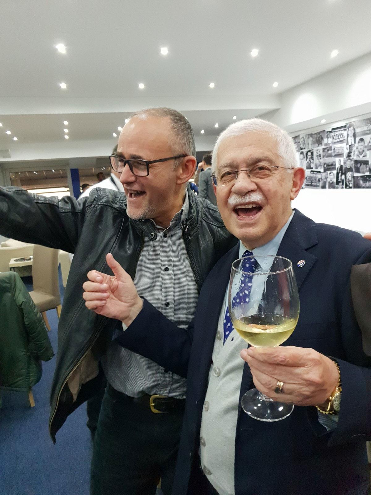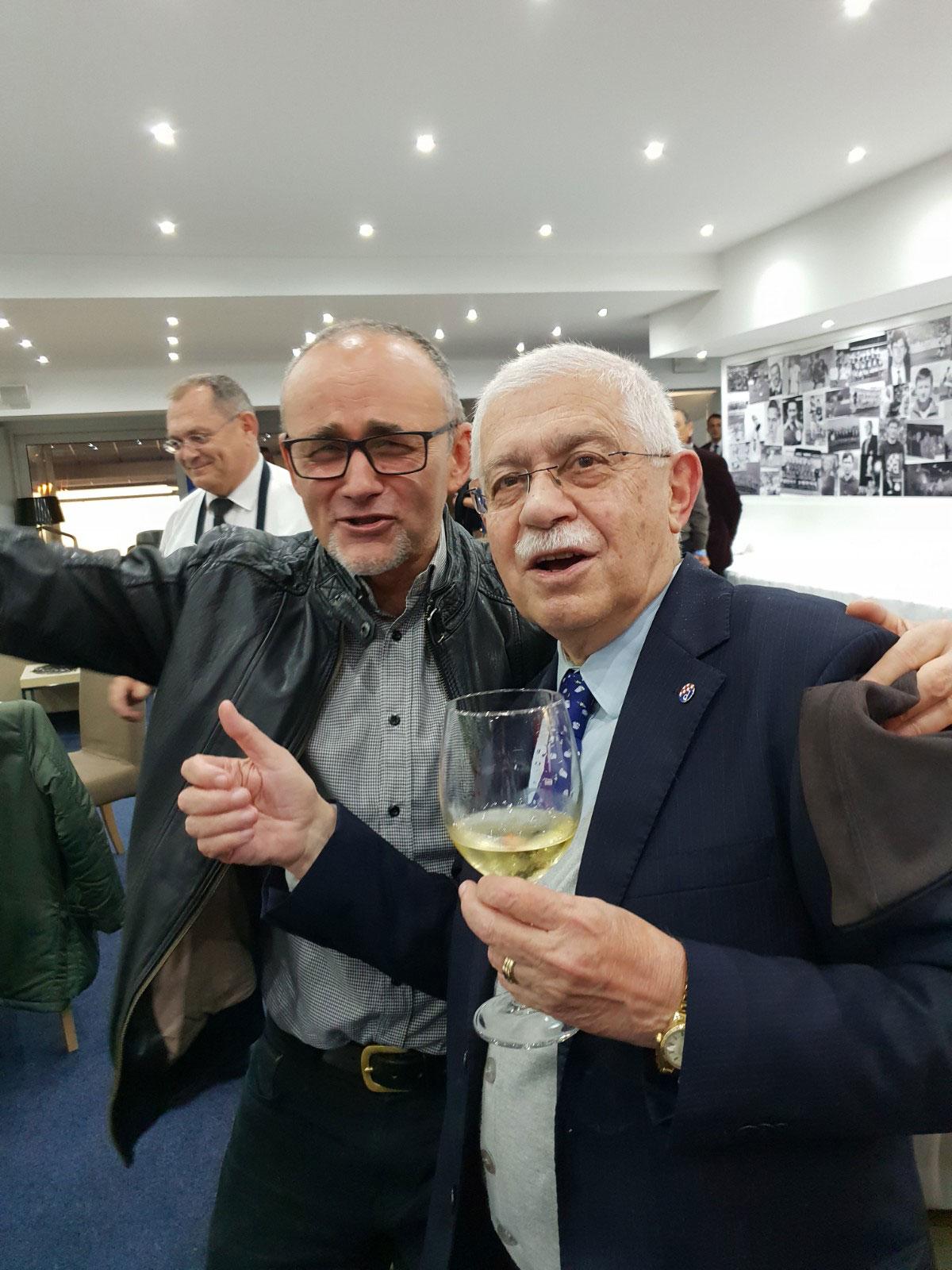 Na drugoj fotografiji vidi se sudac Krušlin kako s Adolfom Kožulom, članom Izvršnoga odbora GNK Dinama, očigledno pjeva u VIP prostorijama stadiona.