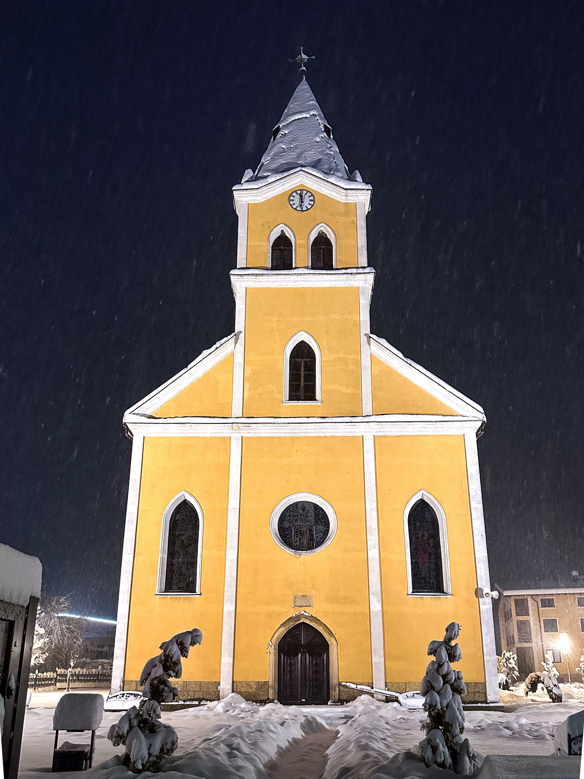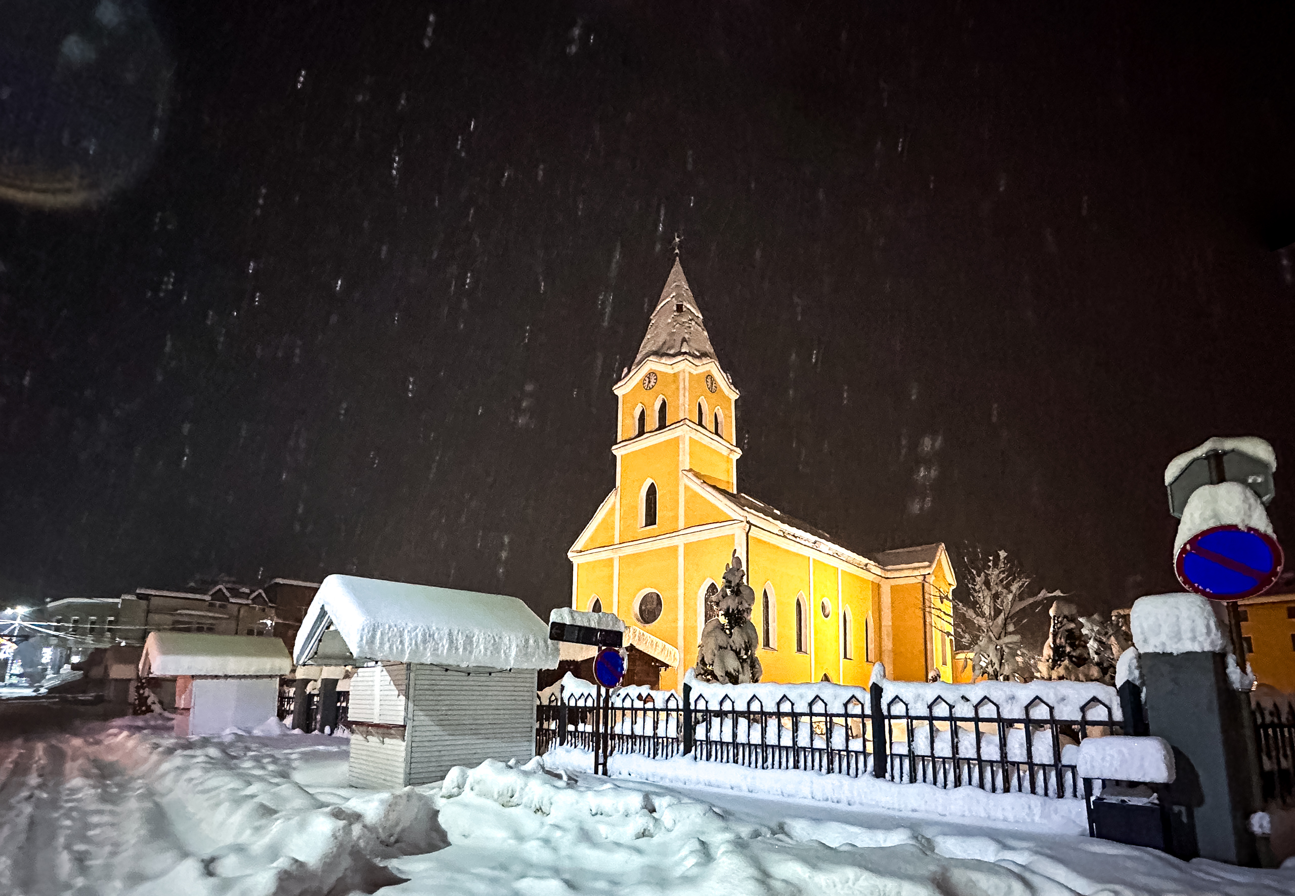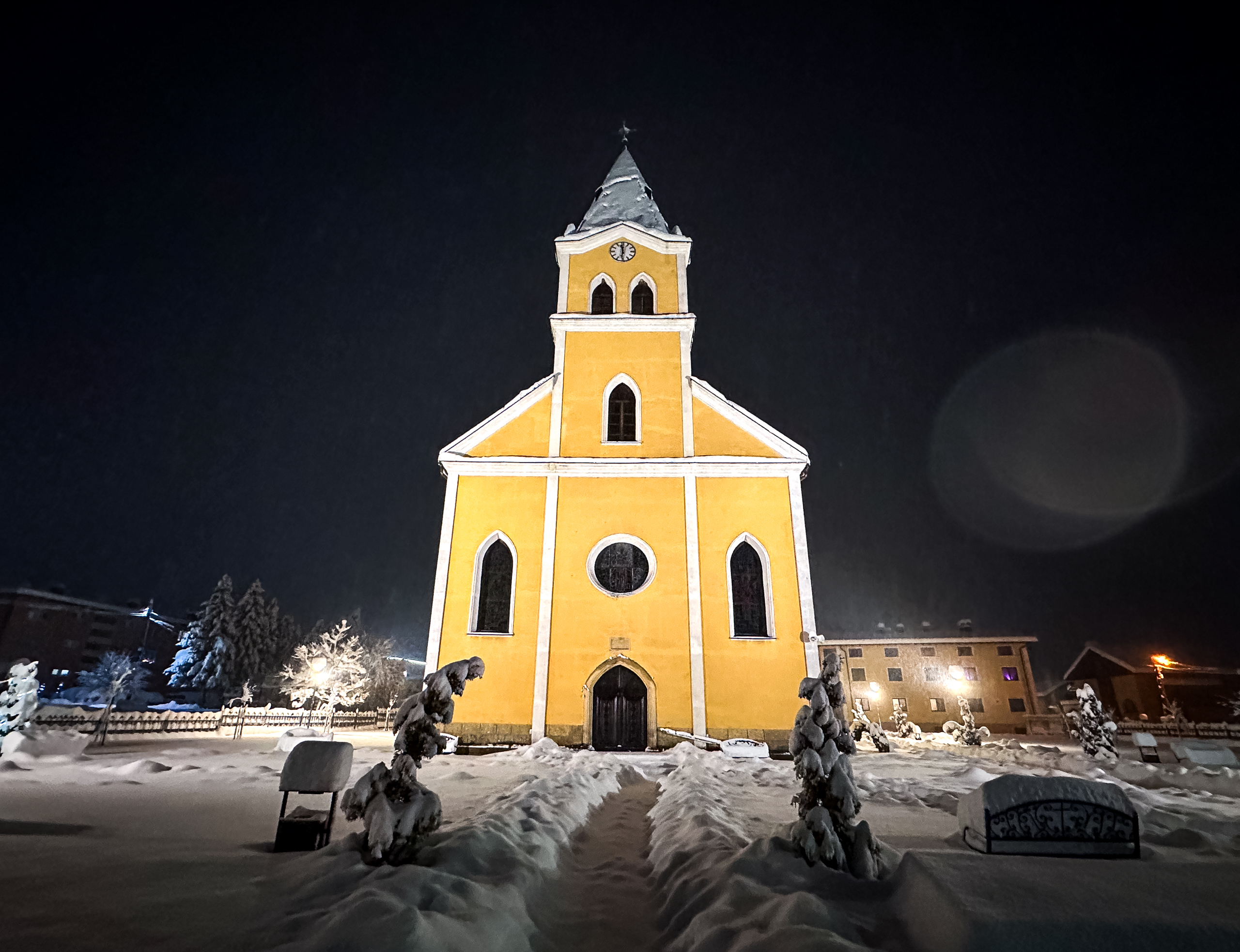 Dok su se neki odlučili ugrijati u kafićima uz čaj, vino ili pivo, naša crkva večeras je zablistala u posebnom zimskom ruhu – tiha, žuto-bijela i gotovo filmska.