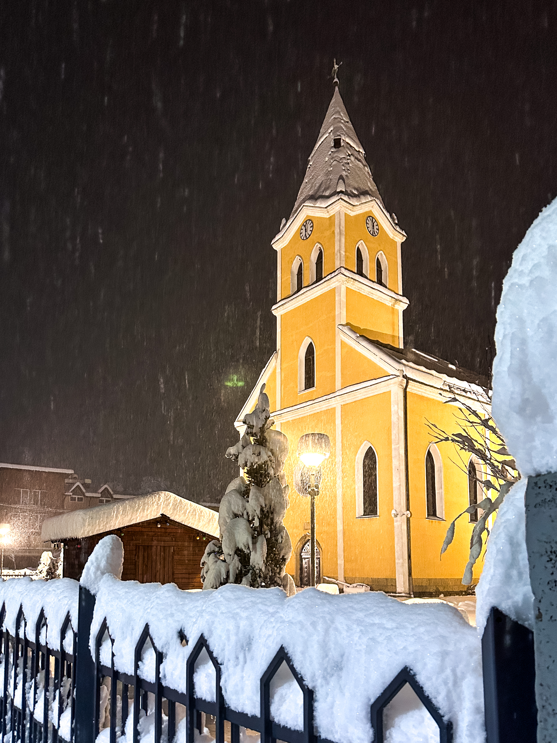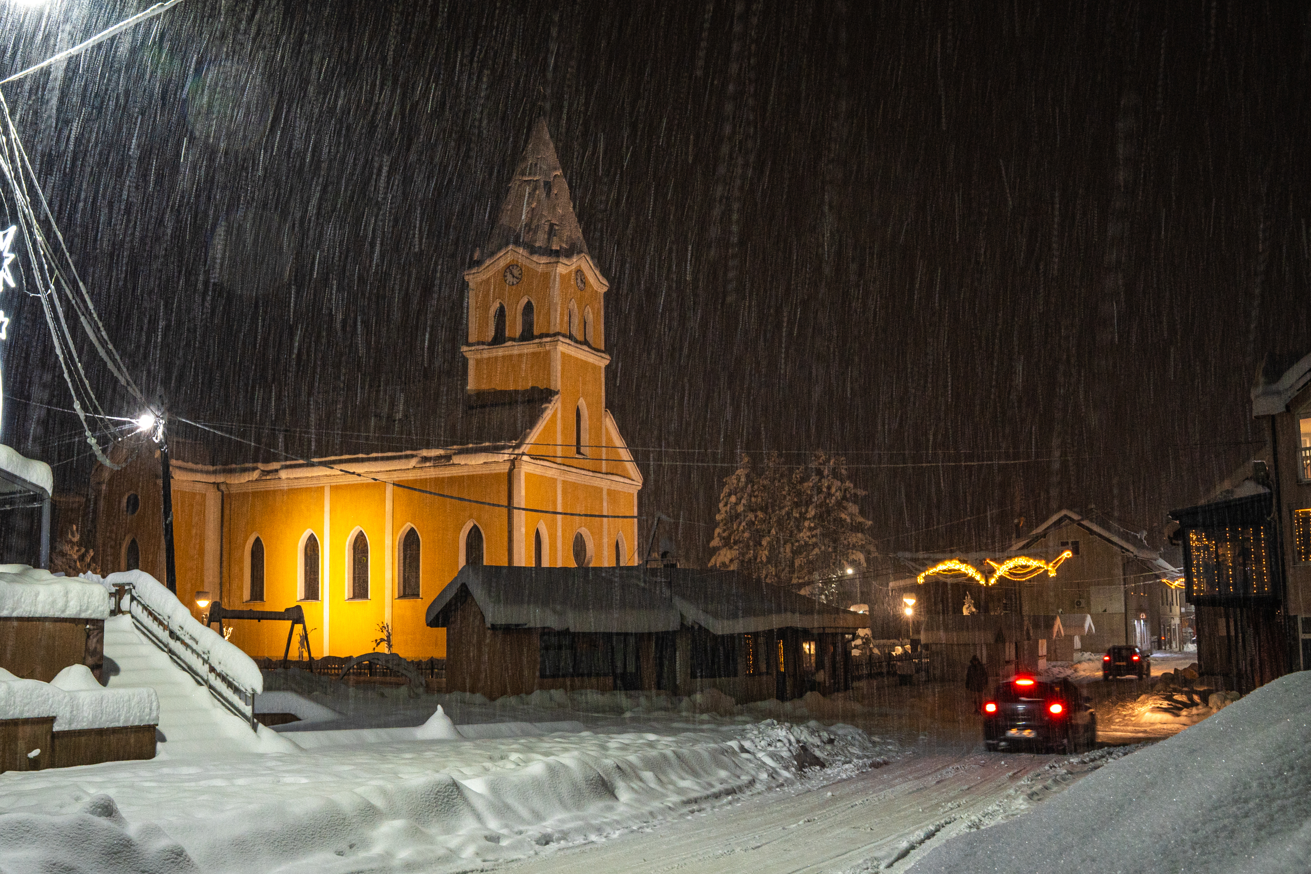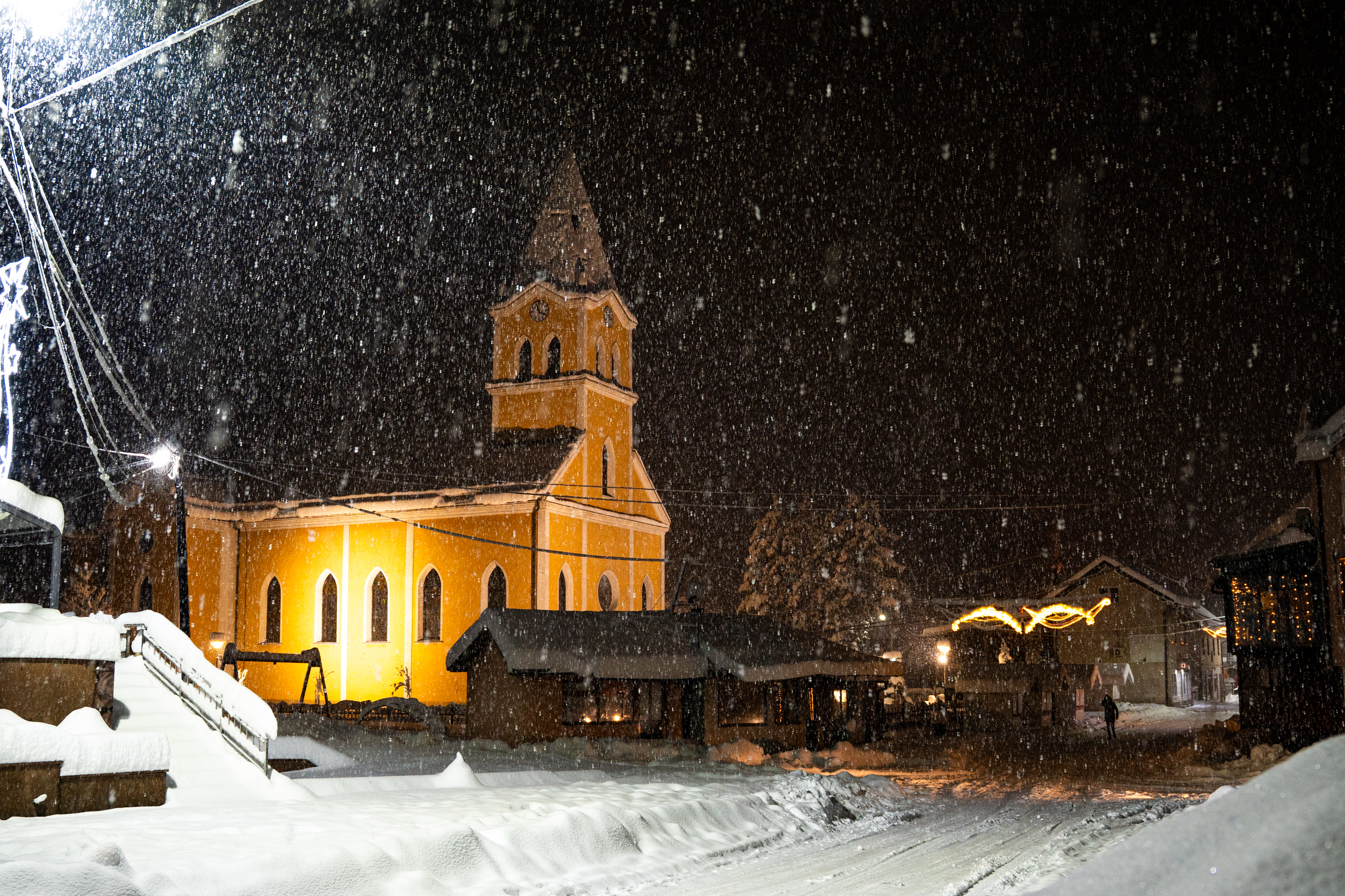 Dok su se neki odlučili ugrijati u kafićima uz čaj, vino ili pivo, naša crkva večeras je zablistala u posebnom zimskom ruhu – tiha, žuto-bijela i gotovo filmska.