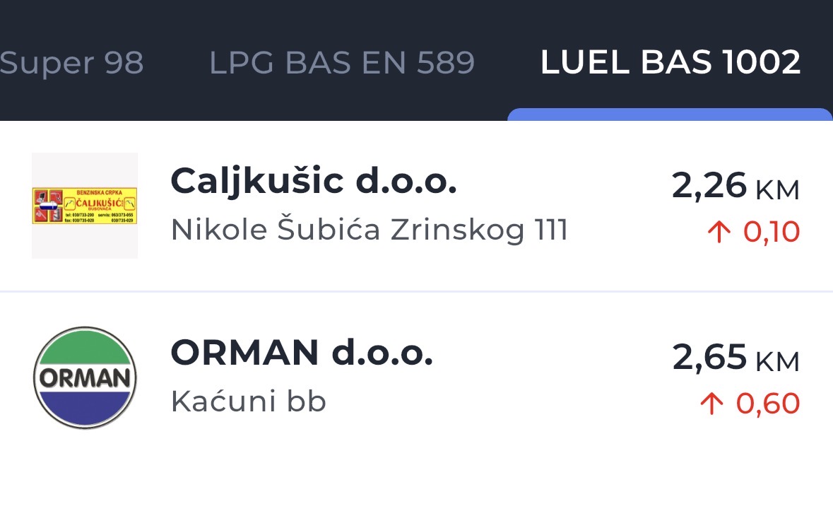 Prosječna maloprodajna cijena premium bezolovnog benzina 95 na današnji dan iznosi 2,48 KM po litri, a dizela 3,06 KM.