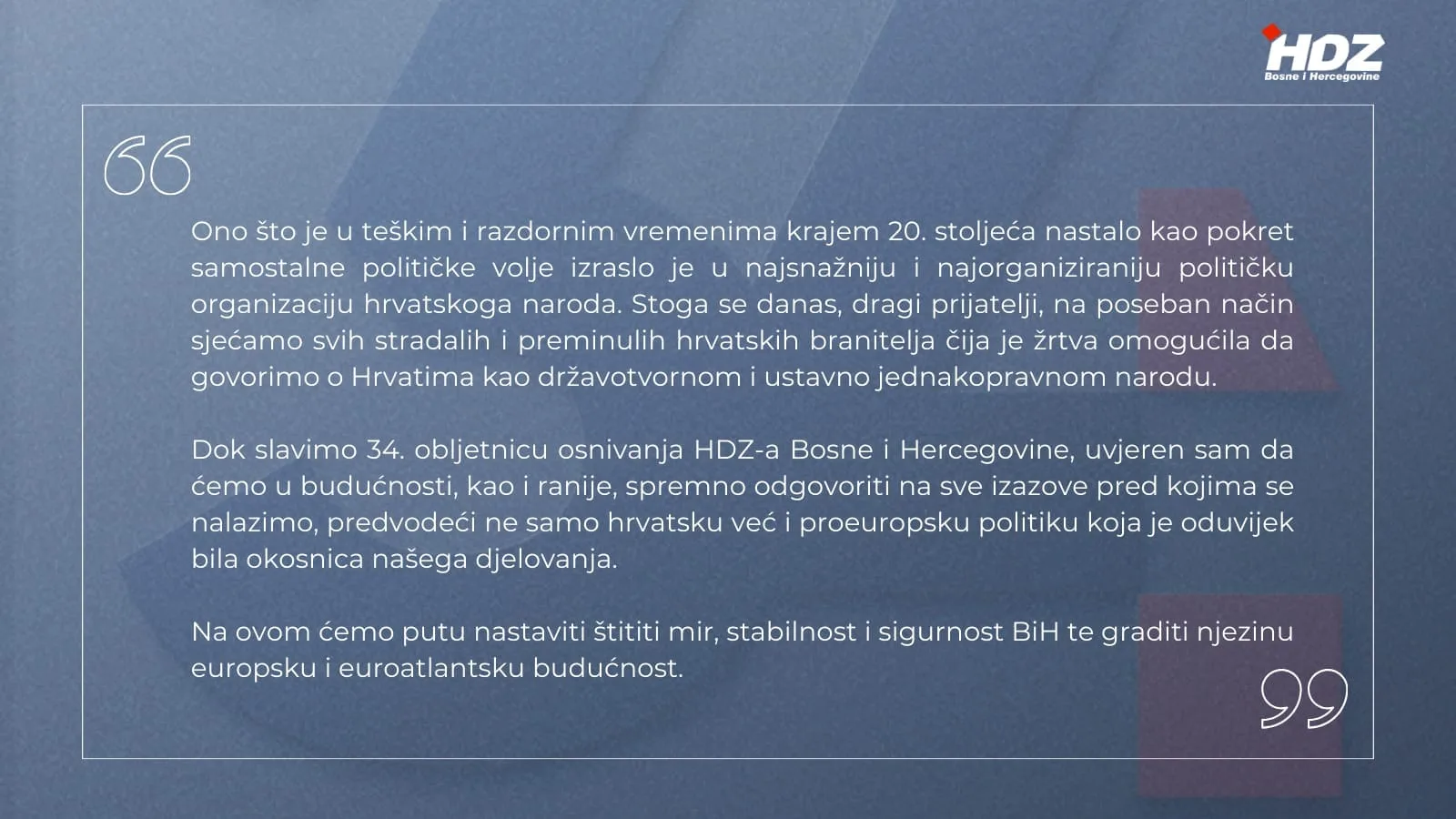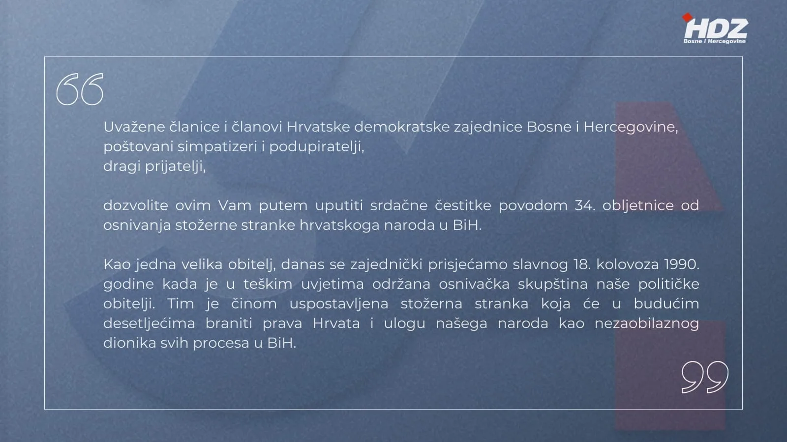 Kao jedna velika obitelj, danas se zajednički prisjećamo slavnog 18. kolovoza 1990. godine kada je u teškim uvjetima održana osnivačka skupština naše političke obitelji. Tim je činom uspostavljena stožerna stranka koja će u budućim desetljećima braniti prava Hrvata i ulogu našega naroda kao nezaobilaznog dionika svih procesa u Bosni i Hercegovini.