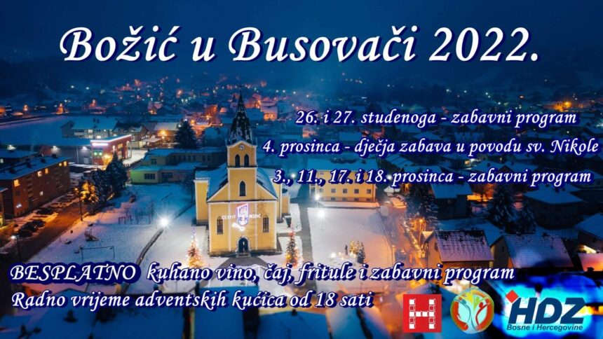 Tradicionalna blagdanska manifestacija „Božić u Busovači“, koju organizira OO HDZ-a BiH Busovača u suradnji s udrugom „Mladi zajedno“ počinje u subotu, 26. studenoga 2022. godine s početkom u 18 sati.