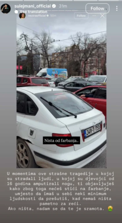 Na Instagram Storyju podijelila je fotografiju kolone vozila na glavnoj prometnici uz komentar: „Ništa od farbanja“. Objavu je ubrzo uklonila, no snimke zaslona u međuvremenu su se proširile društvenim mrežama.