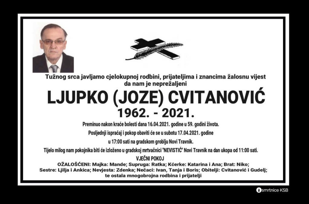 Sahrana pokojnog Ljupka Cvitanovića održat će se danas u 17 sati na Gradskom groblju u Novom Travniku.