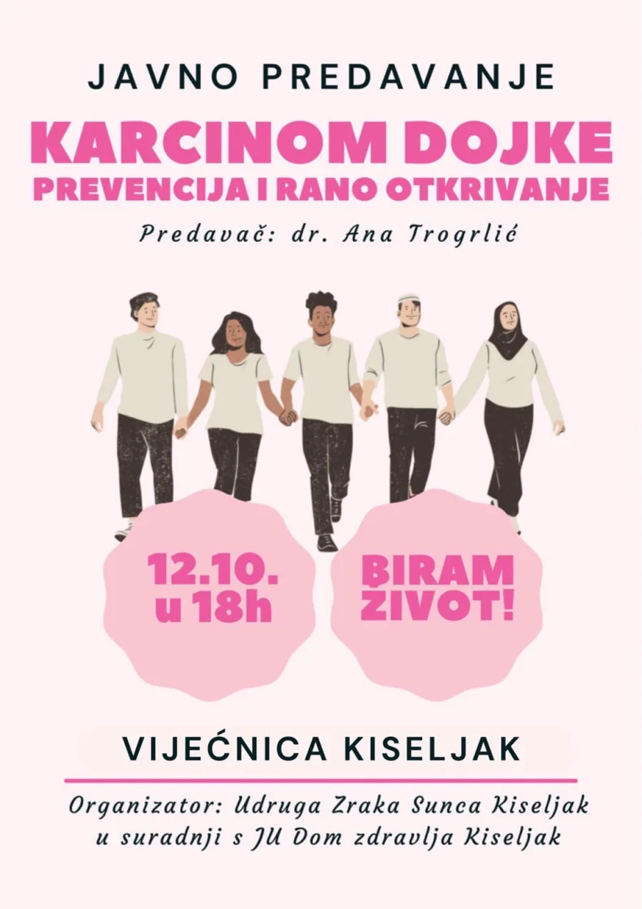 U Vijećnici Kiseljak, u četvrtak, 12. listopada 2023. godine, s početkom u 18 sati, održat će se javno predavanje pod nazivom “Karcinom dojke – prevencija i rano otkrivanje.” Ovo vrijedno predavanje organizira Udruga “Zraka sunca” Kiseljak u suradnji s Javnom ustanovom Dom zdravlja Kiseljak.