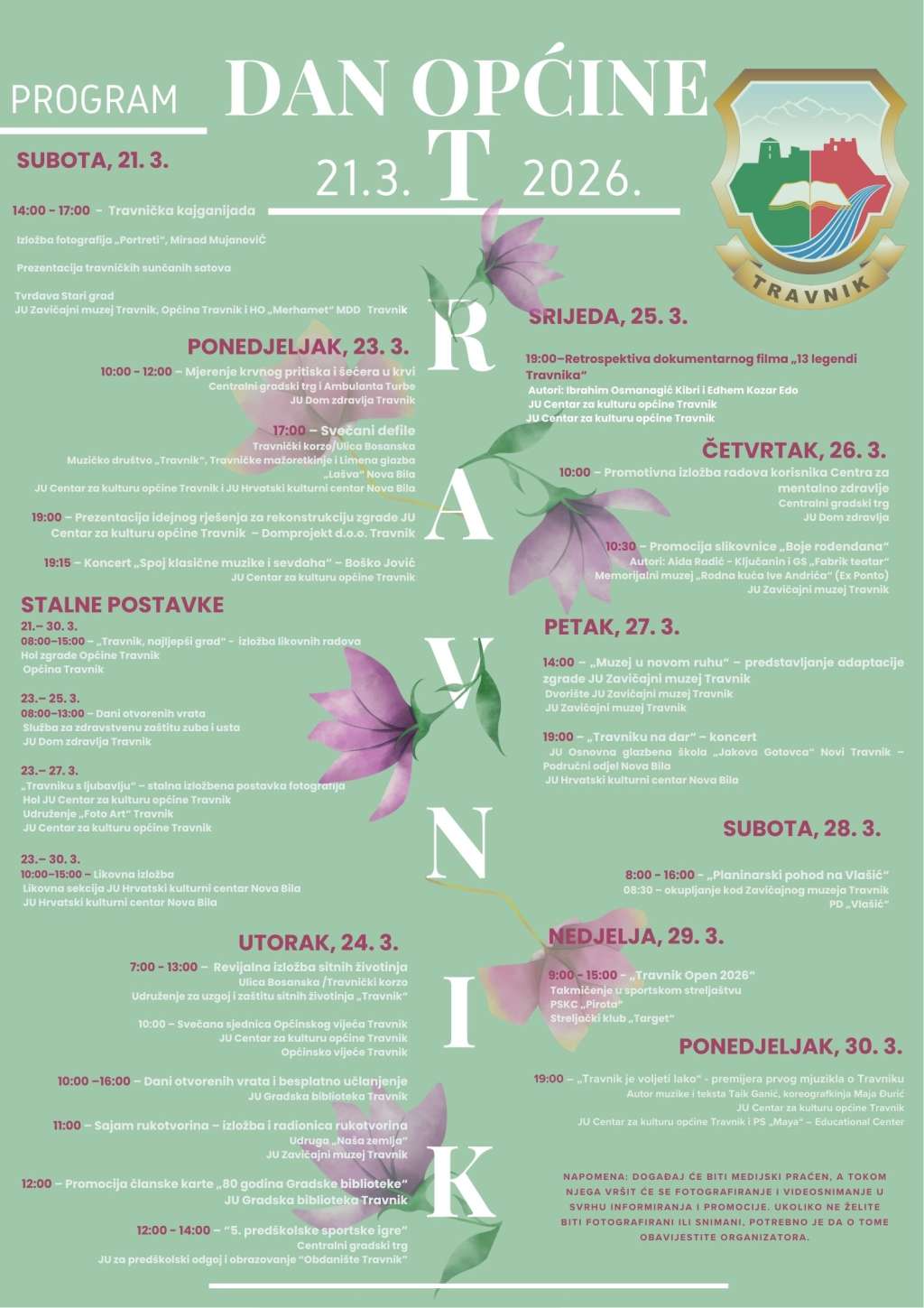 Dolazak proljeća u Travniku i ove godine bit će obilježen manifestacijom “Dan općine Travnik”, koja će se održati od 21. do 30. ožujka. Riječ je o jednoj od najznačajnijih općinskih manifestacija koja već više od desetljeća okuplja brojne sudionike i posjetitelje te kroz raznovrstan program promovira vrijednosti i potencijale lokalne zajednice.