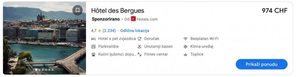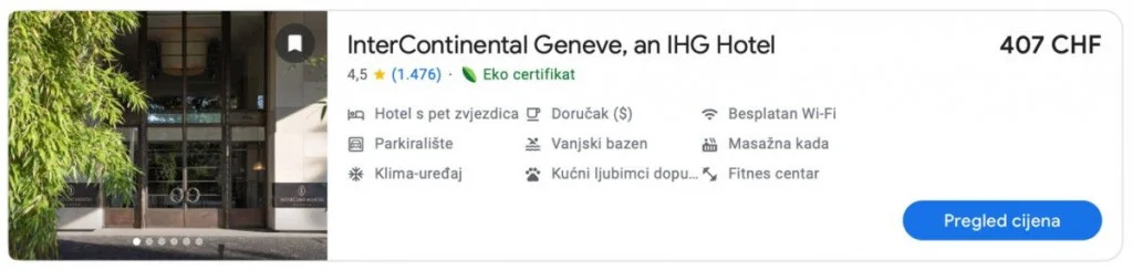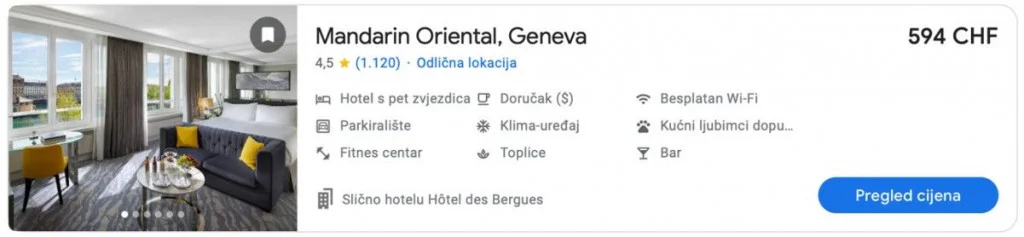 Istraživanjem stranica za rezervaciju smještaja može se utvrditi da je od Komšićevog hotela skuplji samo jedan, i to Hotel Woodward koji se isto tako nalazi uz samo jezero u Ženevi.