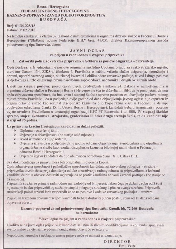 Kazneno-popravni Zavod poluotvorenog tipa Busovača objavljuje Javni oglas za prijem u radni odnos u svojstvu pripravnika