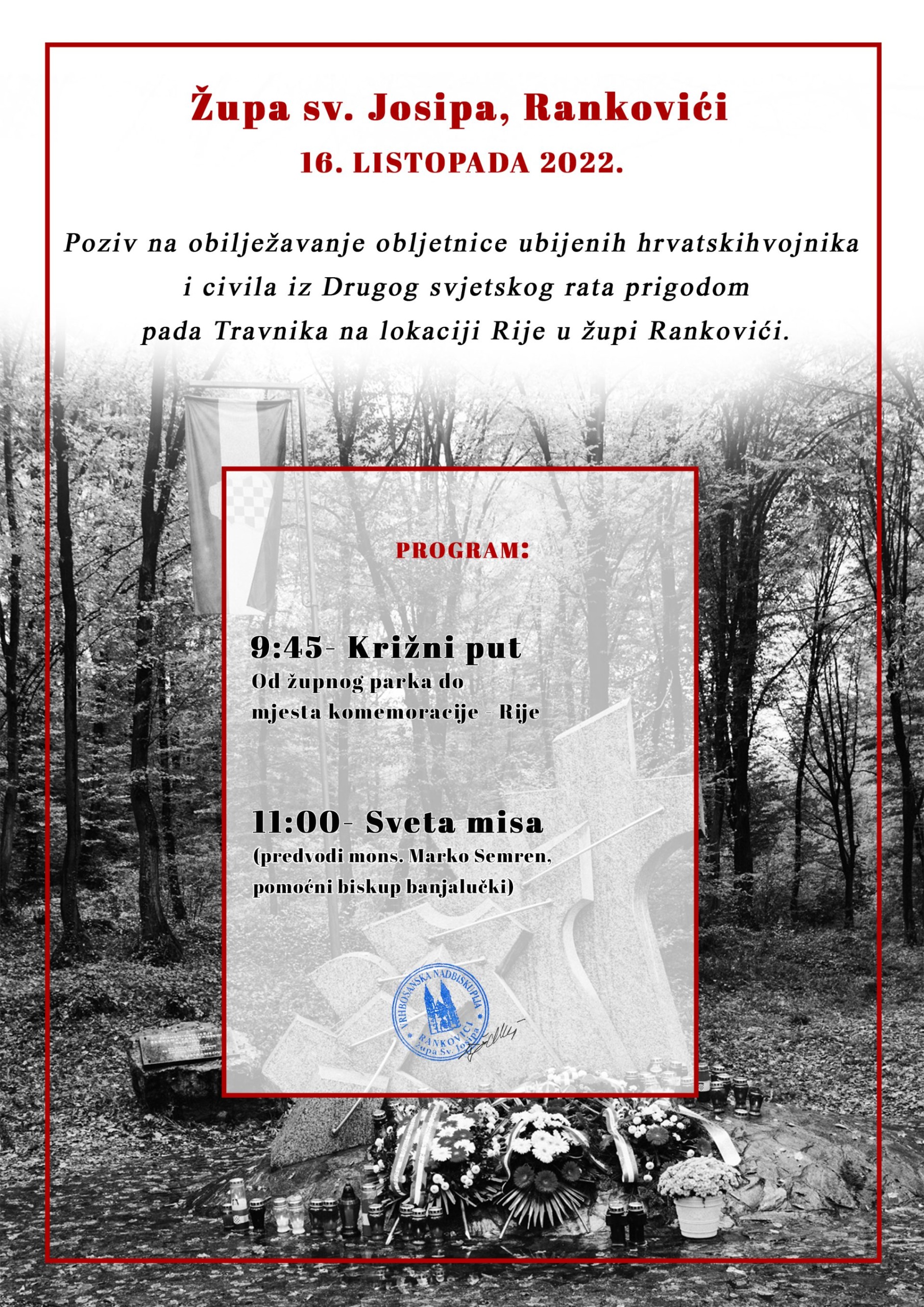 Naime, Župa sv. Josipa u Rankovićima organizira prigodan program i obilježavanje koje počinje Križnim putem u 9:45 sati (od župnog parka do mjesta komemoracije Rije). S početkom u 11 sati bit će služena sveta misa zadušnica koju prevodi mons. Marko Semren, pomoćni biskup banjalučki.