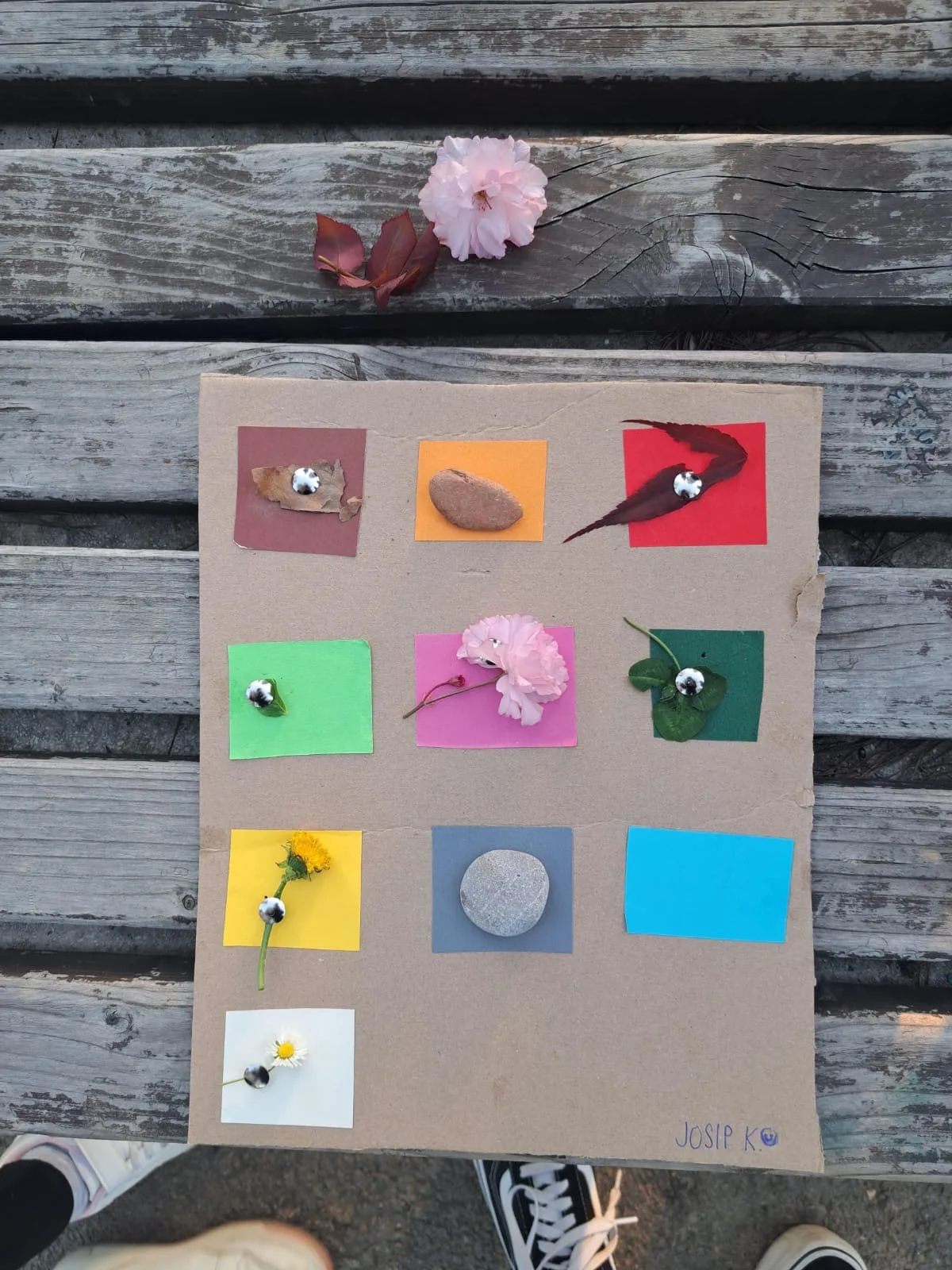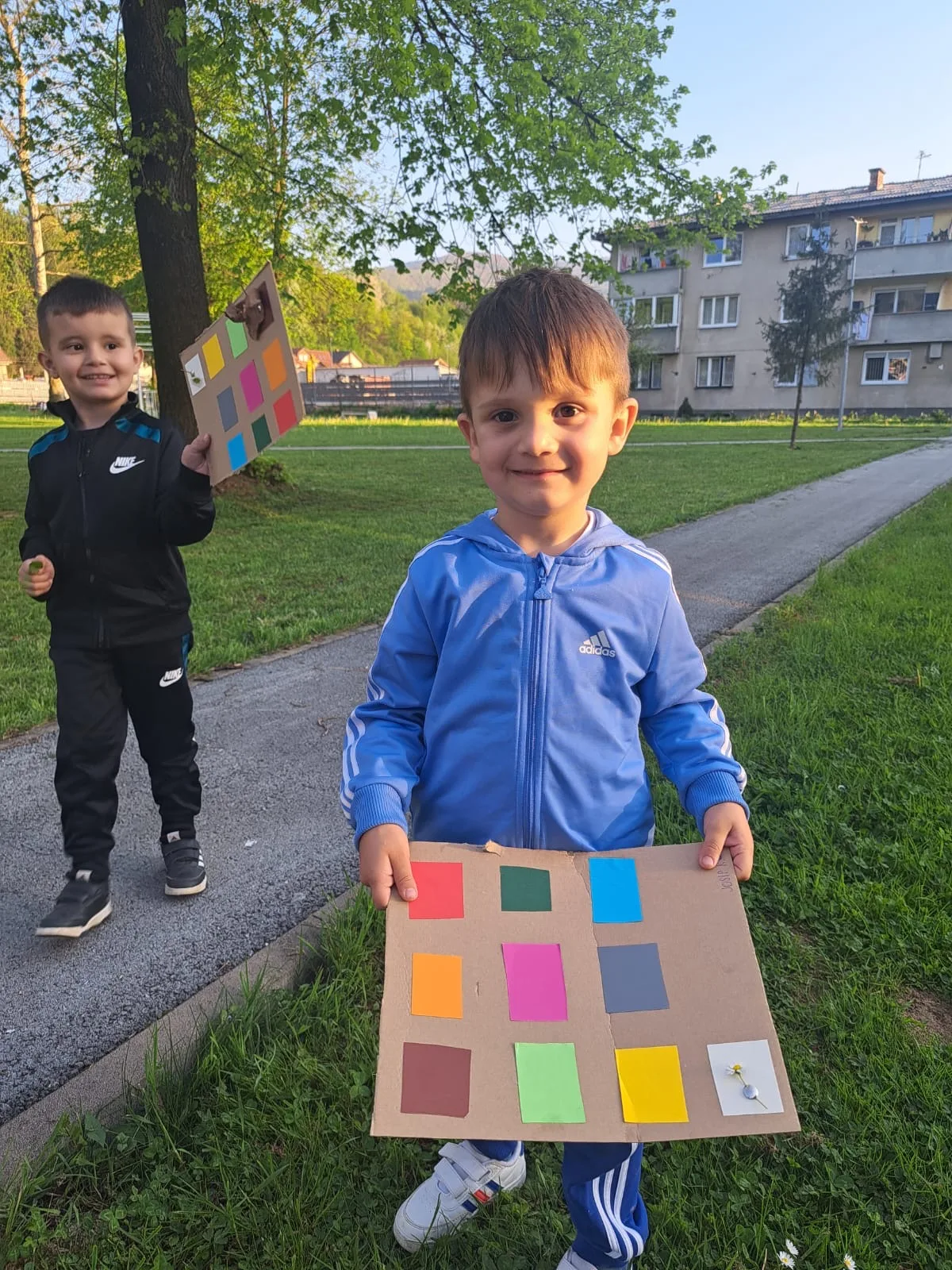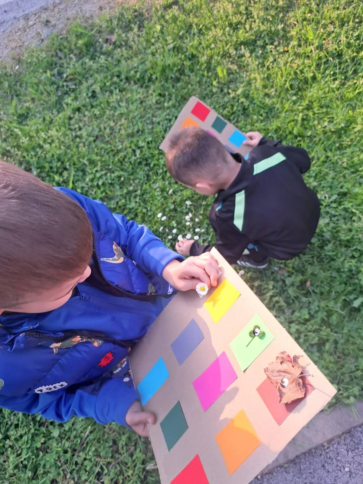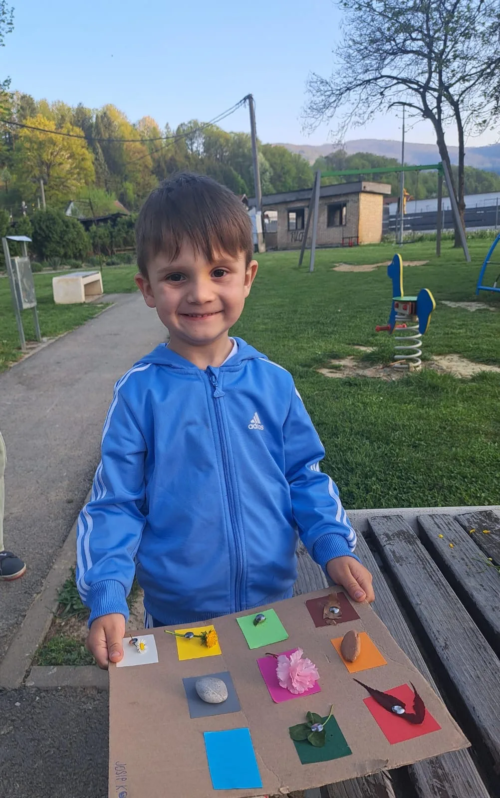 Zadatak je bio pronalazak različitih boja u prirodi. Na kartone smo zalijepili kartice različitih boja s ciljem da u prirodi pronađemo nešto što je odgovarajućih boja. Lišće, cvijeće, kamenčići, grančice… sve je dolazilo u obzir. ☀️