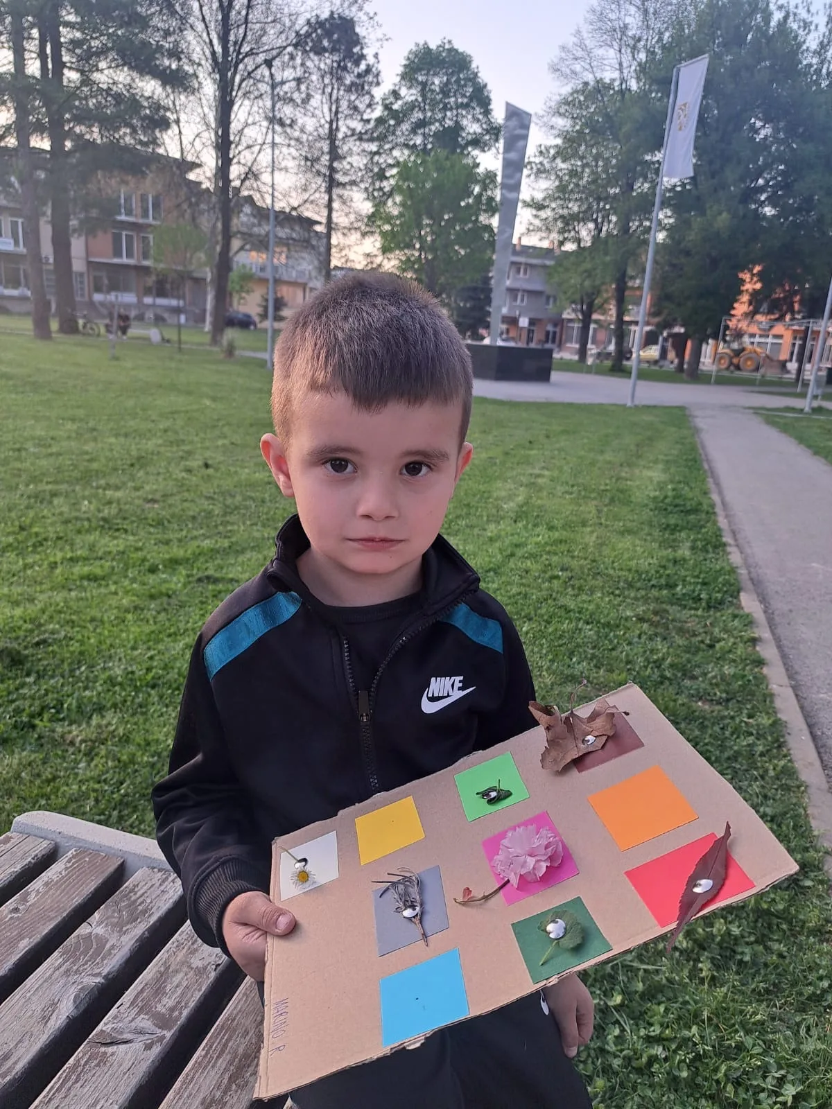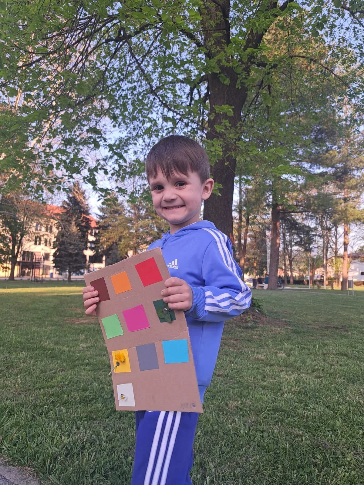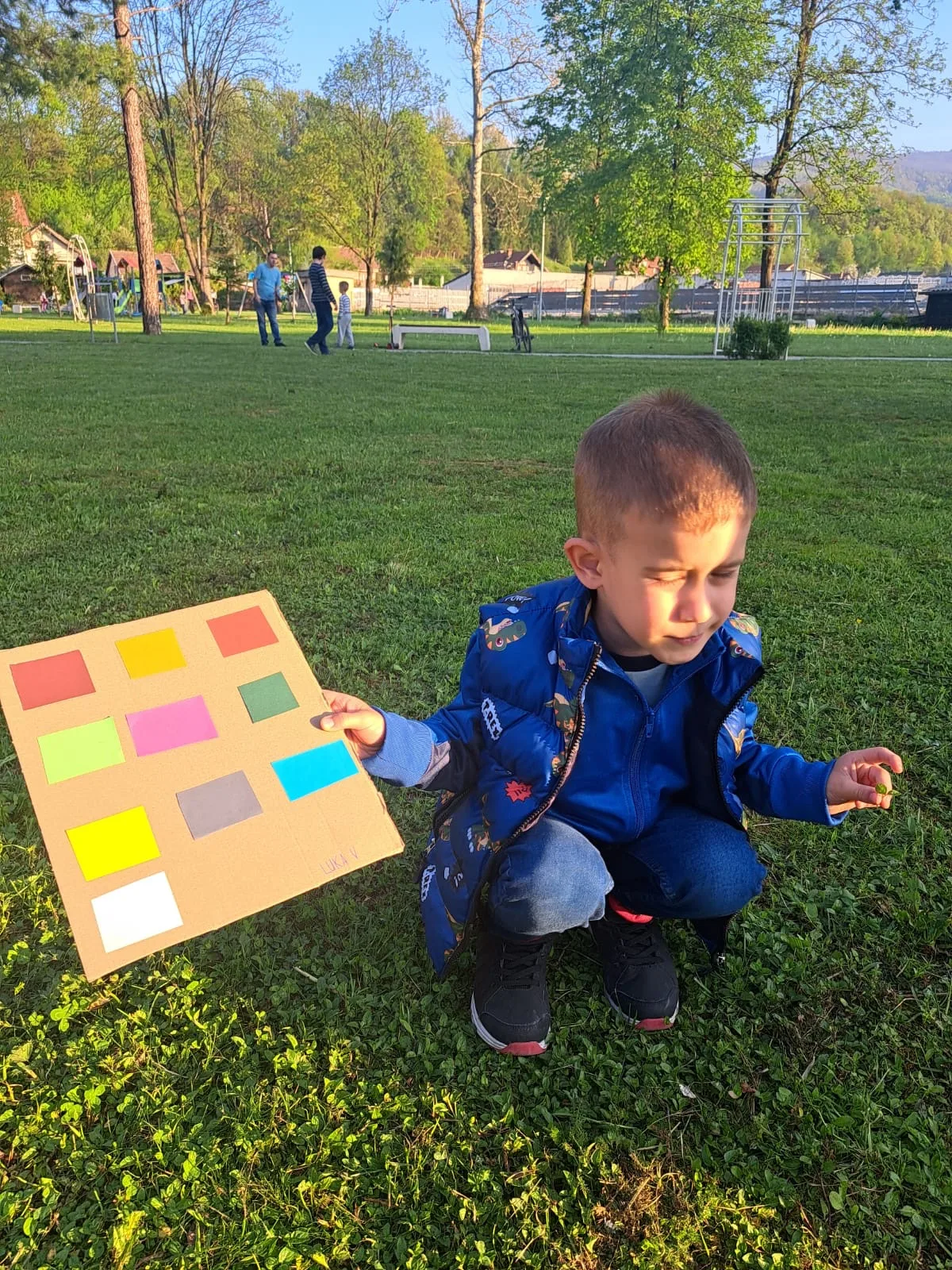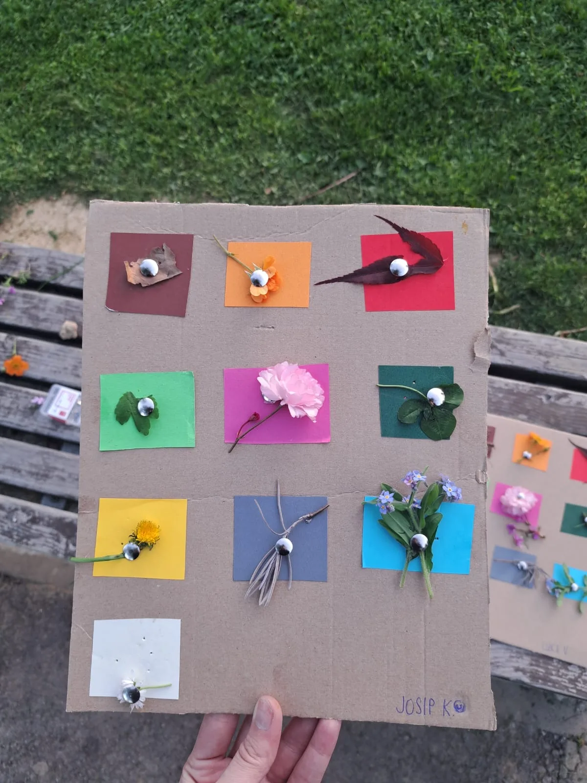 Zadatak je bio pronalazak različitih boja u prirodi. Na kartone smo zalijepili kartice različitih boja s ciljem da u prirodi pronađemo nešto što je odgovarajućih boja. Lišće, cvijeće, kamenčići, grančice… sve je dolazilo u obzir. ☀️