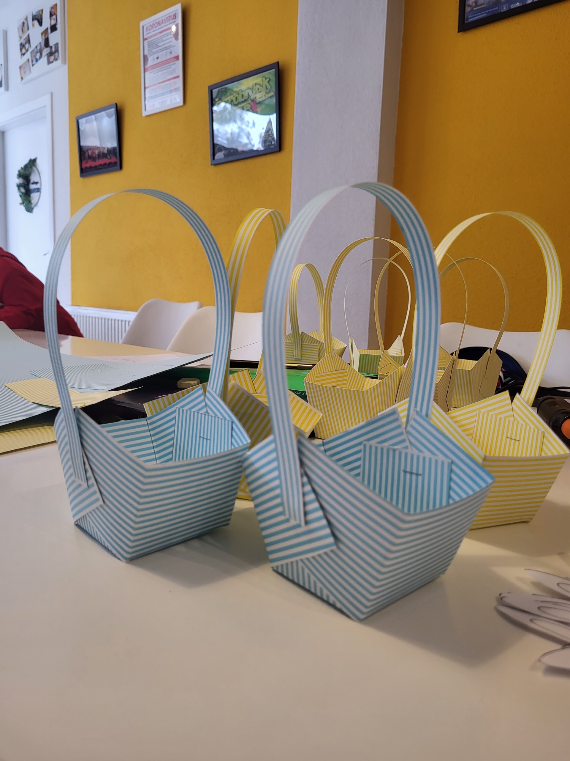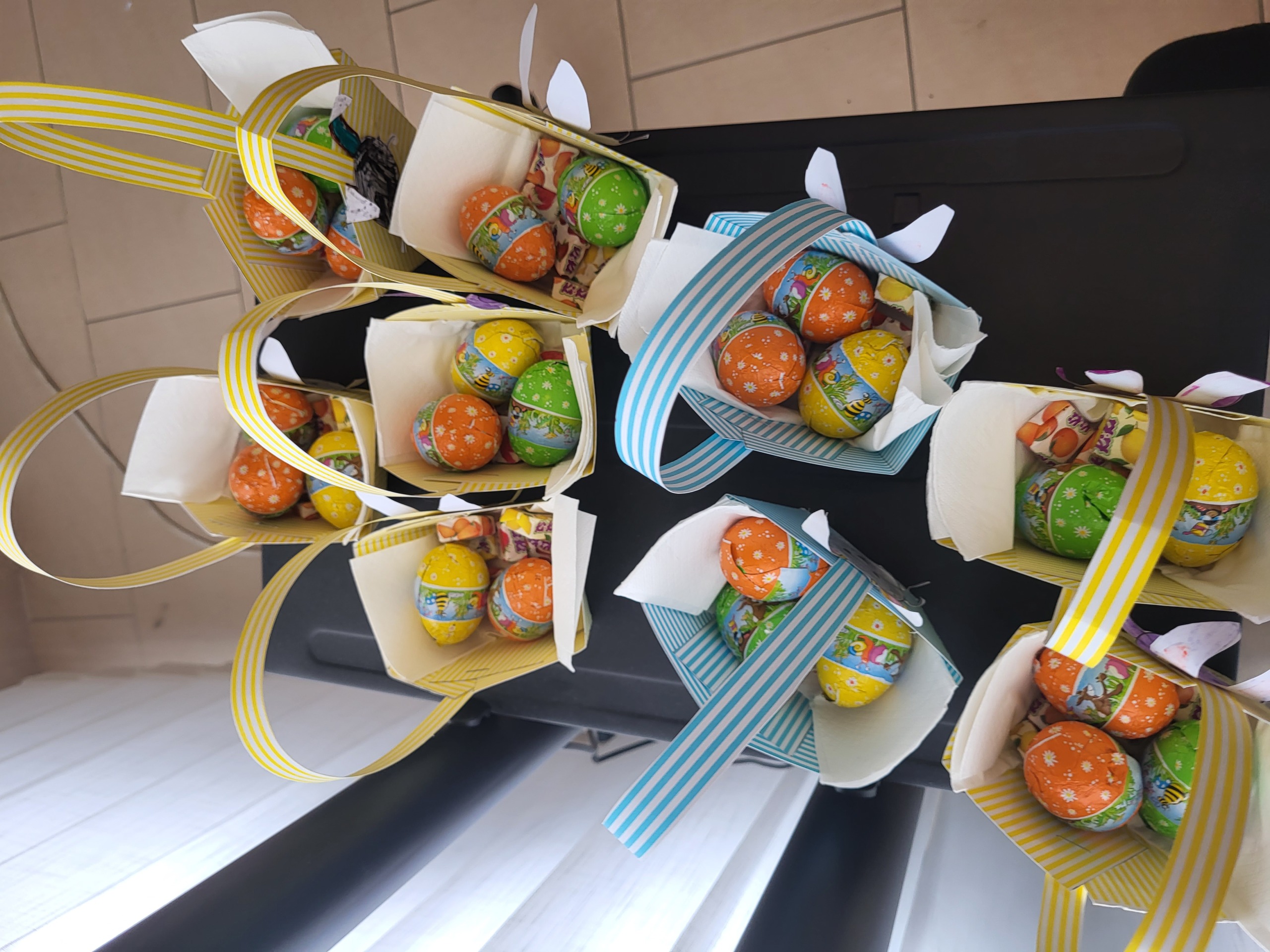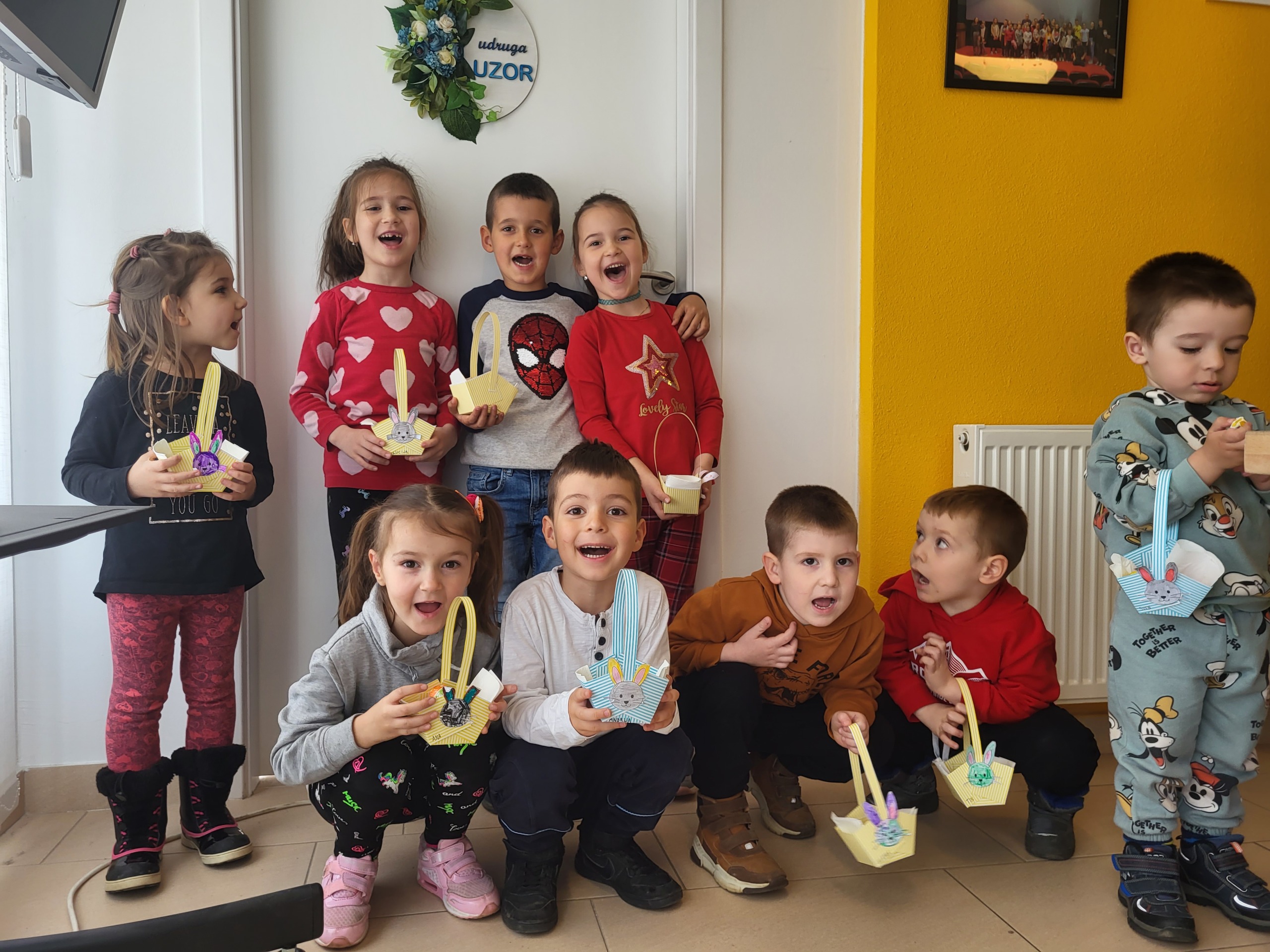 Drugi dio radionice posvetili smo izradi košarica i zečića za Uskrs. Košarice smo pravili od ukrasnog hamer papira, dok su djeca bojila i ukrašavala zečiće koje smo zalijepili na košarice. Na kraju smo napunili košarice čokoladnim jajima i bombonama kao poklon za Uskrs i zahvalu za ukazano povjerenje. Pored izrade košarica imali smo vremena i za društvene igre i aktivnosti za vježbu percepcije i zapažanja uz samostalno kreirane materijale.