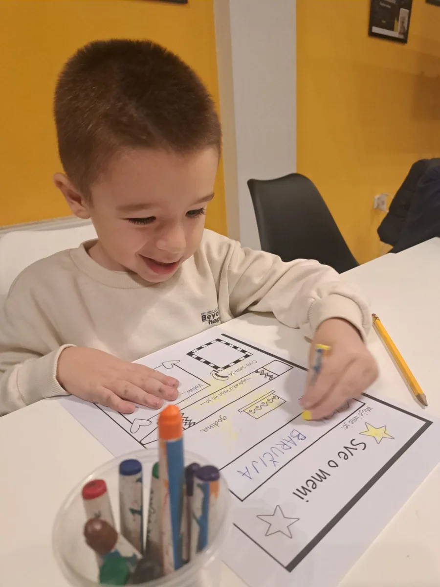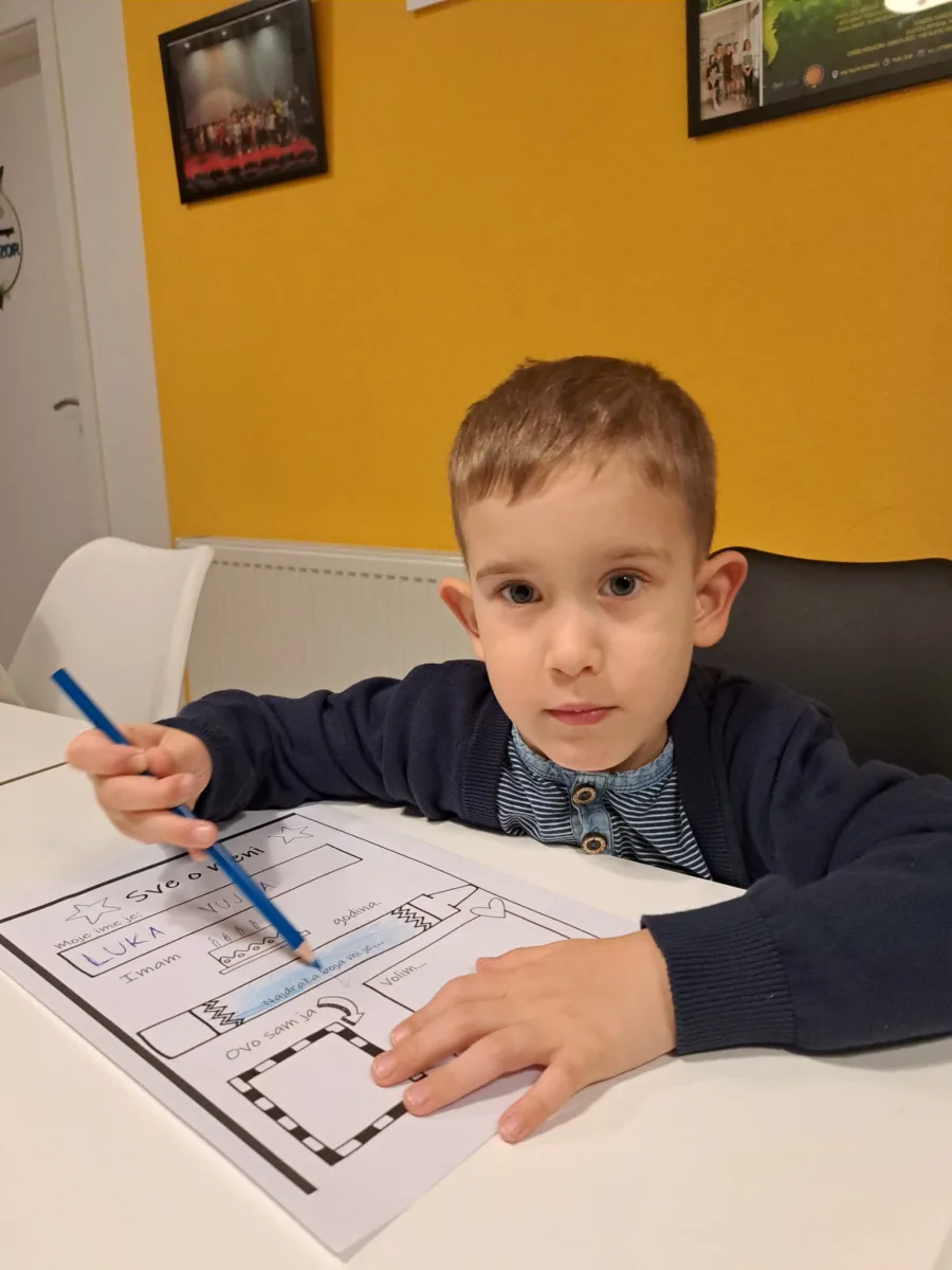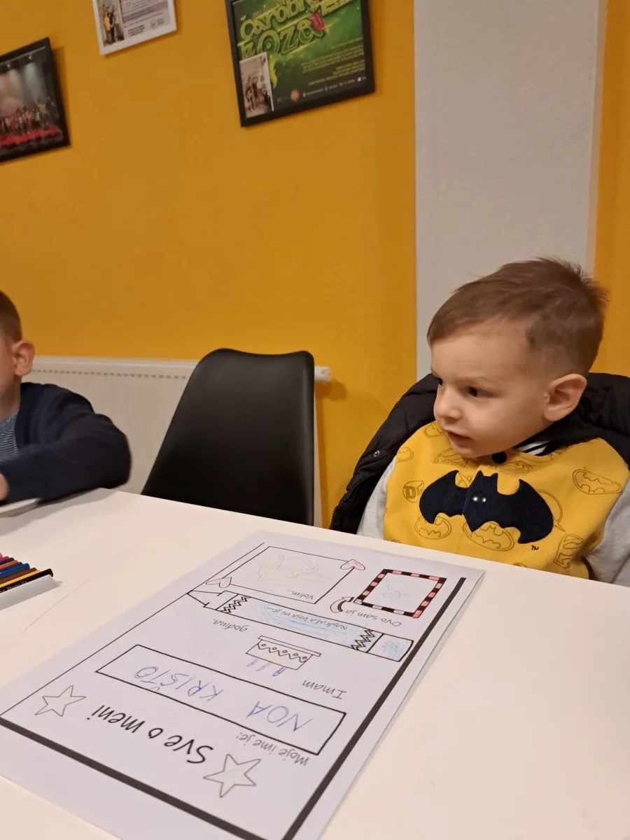 ♡ Okupljeni mališani uzrasta od 3 do 6 godina su prošli kratko međusobno upoznavanje kroz aktivnosti usmjerene na razgovor o sebi i svojoj obitelji. Po samom dolasku imali smo priliku crtati, razgovarati i upoznati se, nakon čega je slijedila aktivnost koju smo nazvali – Sve o meni. Svaki sudionik za ovu aktivnost dobio je radni listić sa nekoliko podataka o sebi koje smo zajedno ispunjavali, poput imena i prezimena, uzrasta, označili smo svoju omiljenu boju, nacrtali svoj portret i neku svoju omiljenu aktivnost. Listići su pomogli da se bolje upoznamo, a sljedeći zadatak bio je crtež obitelji.