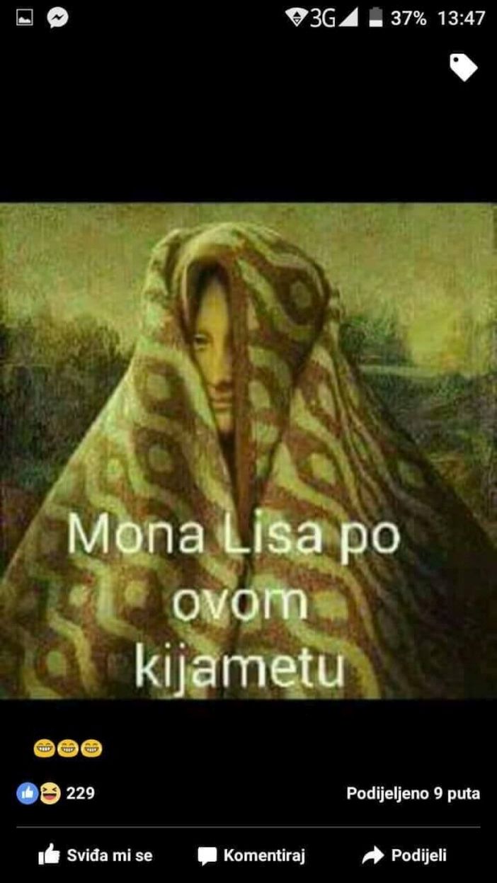 I slavna Mona Lisa se ponovo našla na udaru komičara, ovaj put su je zamotali u deku, preventive radi. Napolju je hladno!