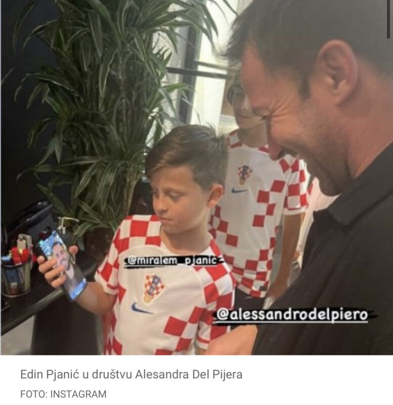 Zajedno s Miralemom “Vatrene” bodri i njegov sin Edin (9). Miralem je na Instagramu podijelio fotografiju sina Edina koji je u dresu Hrvatske bio u društvu legendarnog Alessandra Del Piera.