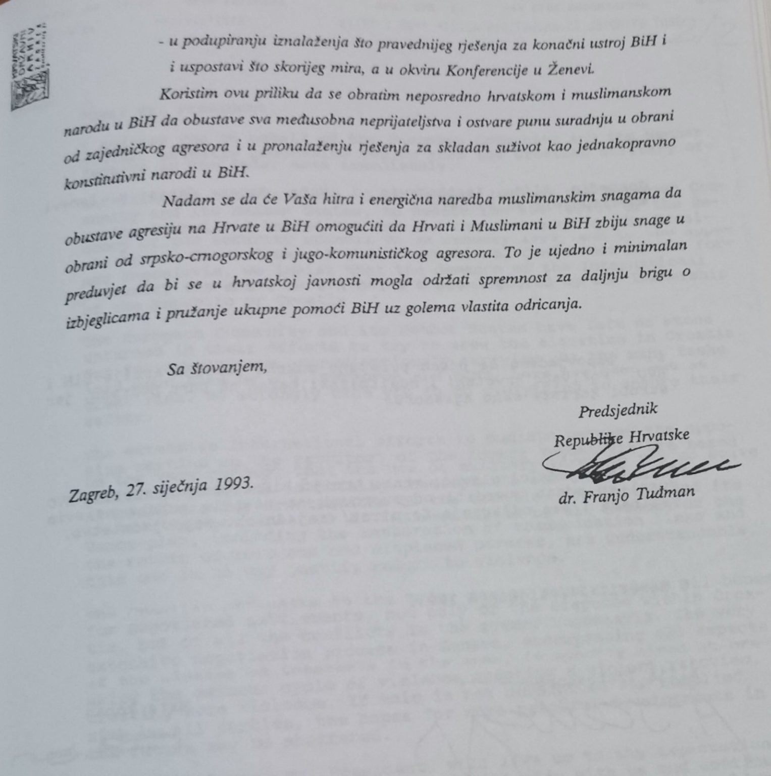 Godina UZP-a – Tuđman apelira na zaustavljanje operacija jer ista može do kraja zaoštriti odnose između Hrvata i Muslimana, poziva na zaustavljanje svih neprijateljstava između dvije vojske i da se osiguraju združeni napori prema zajedničkom neprijatelju.