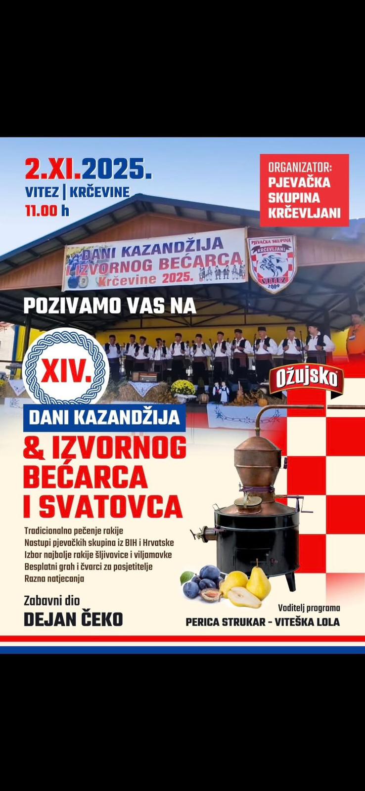 U nedjelju, 2. studenoga 2025. godine, u Krčevinama (Vitez) održat će se 14. Dani kazandžija i izvornog bećarca, u organizaciji Pjevačke skupine Krčevljani. Program započinje u 11 sati, a voditelj manifestacije bit će Perica Strukar – Viteška Lola, dok je za zabavni dio zadužen Dejan Čeko.