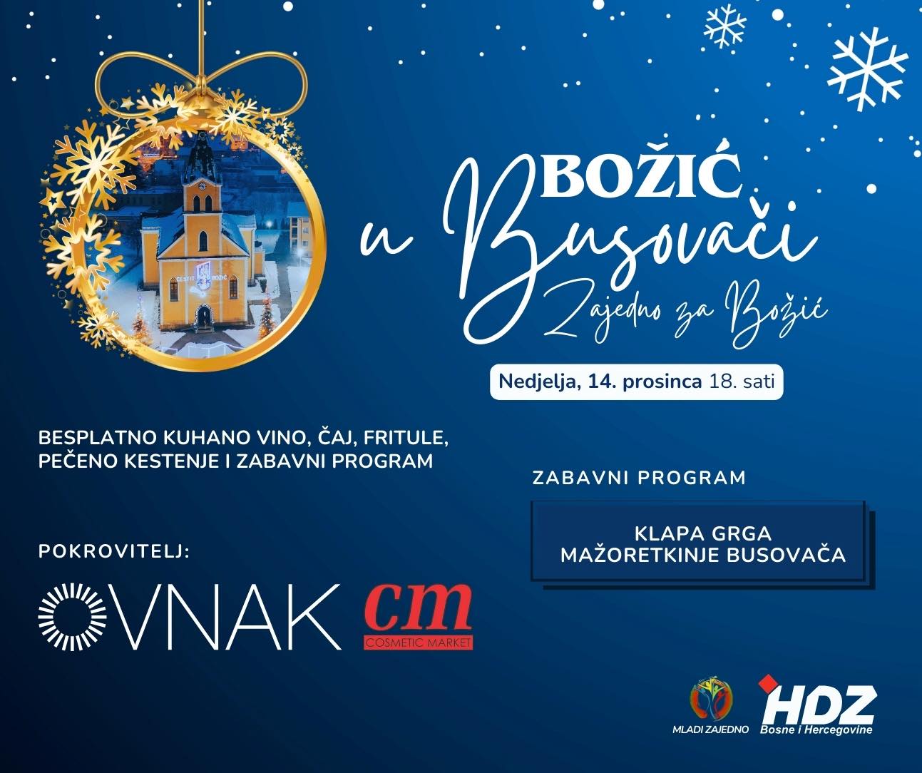 Zahvaljujući pokroviteljima Ovnak d.o.o. Vitez i CM Cosmetic Market, posjetitelje očekuju mirisi i okusi blagdana: besplatno kuhano vino, čaj, fritule i pečeno kestenje, uz toplo adventsko raspoloženje.