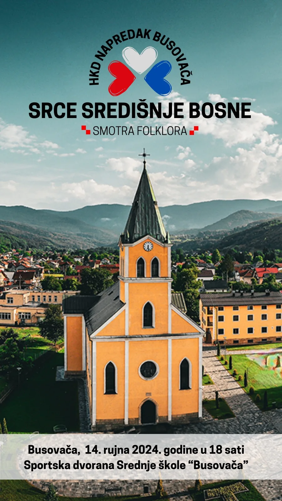 XII. Smotra folklora “Srce Središnje Bosne” bit će održana u subotu, 14. rujna 2024. godine, u sportskoj dvorani Srednje škole “Busovača” u 18:00 sati. Organizator je Hrvatsko kulturno društvo “Napredak” Busovača.