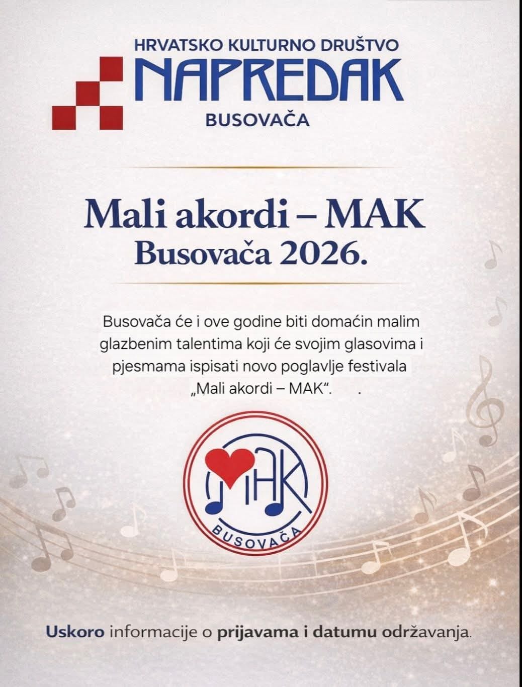 HKD „Napredak“ Busovača s ponosom najavljuje glazbeni festival „Mali akordi – MAK Busovača 2026.“, jedan od najprepoznatljivijih festivala za djecu u Središnjoj Bosni.
