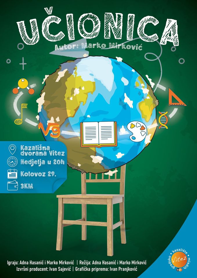 “Predstava “Učionica” namijenjena je za djecu i mlade od prvog do devetog razreda osnovne škole, ali će svakako i oni stariji moći uživati u ovoj uzbudljivoj školskoj priči. Predstava je edukativnog karaktera i savršena je “poslastica znanja” za početak nove školske godine. Učica i učo nas kroz igru i pjesmu vode kroz sve osnovnoškolske predmete izdvajajući razne zanimljivosti i mudrosti. Predstava se premijerno igra u Kazališnoj dvorani u Vitezu, u nedjelju, 29. kolovoza, s početkom u 20,00. Dobro nam došli!”, poručuju iz GKM Vitez.