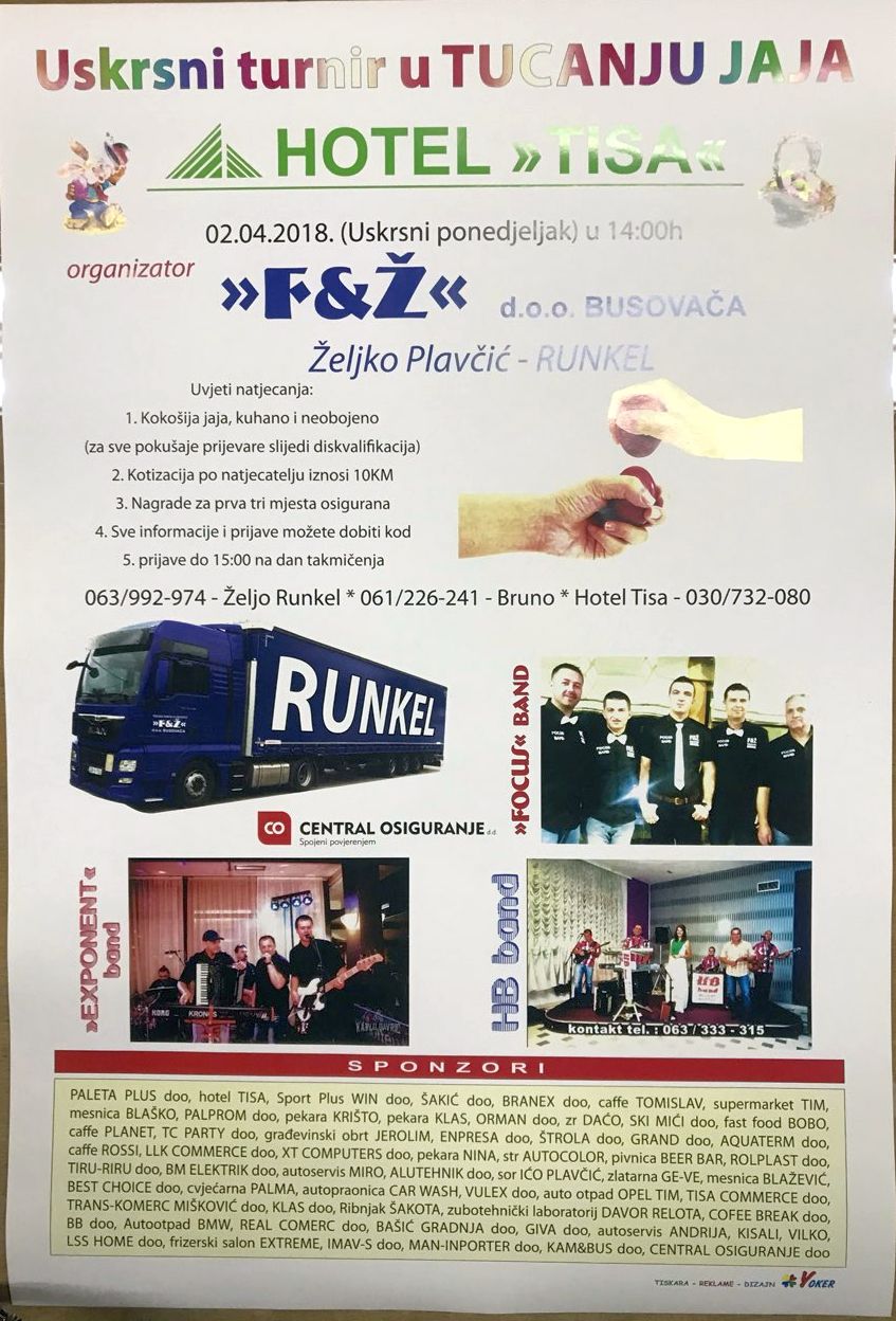 Poduzeće F&Ž d.o.o. Busovača (Željko Plavčić) i ove godine na USKRSNI PONEDJELJAK u hotelu TISA u Busovači organizira veliki USKRSNI TURNIR u tucanju jaja “Busovača 2018”.