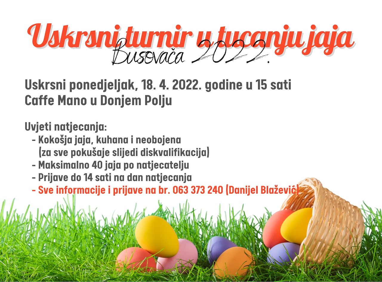 Turnir će ove godine biti održan u kafiću Mano u Donjem Polju. Uvjeti za natjecatelje su isti kao i ranije. Jaja moraju biti kokošja, kuhana i neobojena. Maksimalno je moguće prijaviti 40 jaja po natjecatelju, a prijave su moguće do 14 sati na dan natjecanja. Sve informacije možete dobiti na broj telefona 063 373 240 (Danijel Blažević). Dobrodošli!