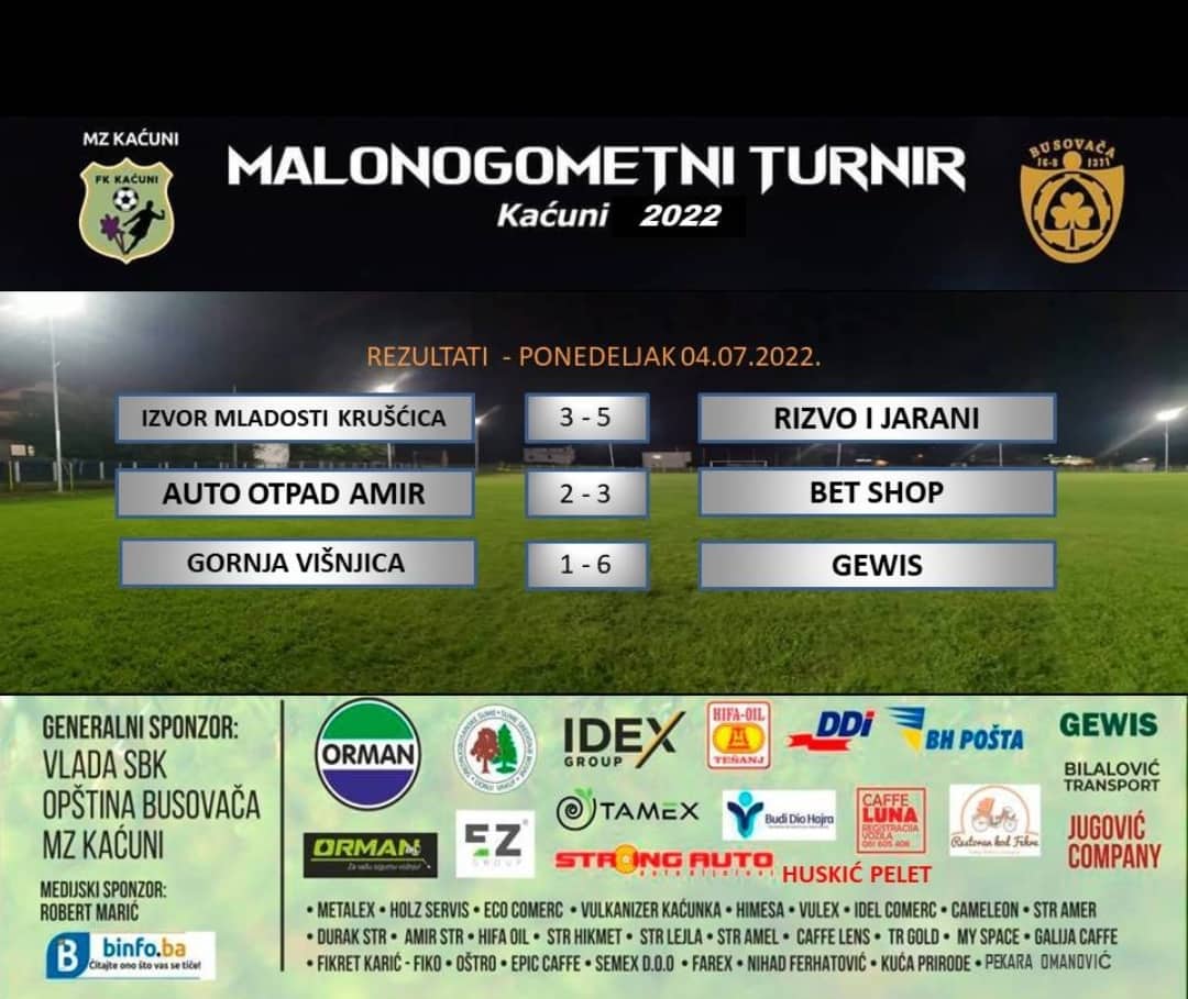 Malonogometni turnir “Kaćuni 2022” nastavlja se večeras odigravanjem ukupno tri utakmice. U prvoj utakmici dana sastaju se Car Wash Aggasi i Elegant Busovača – 20 sati, u drugoj DDI Sarajevo i Autoškola Kompas – 21 sat te u trećoj Vikend Kaćuni i Caffe bar Bagdad Premium u 22 sat.