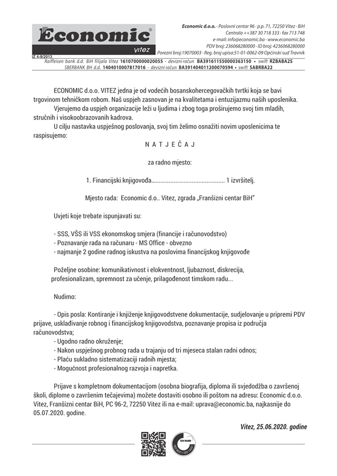 Poduzeće “Economic” d.o.o. Vitez raspisalo je natječaj za posao. Traži se djelatnik za poziciju financijskog knjigovođe.