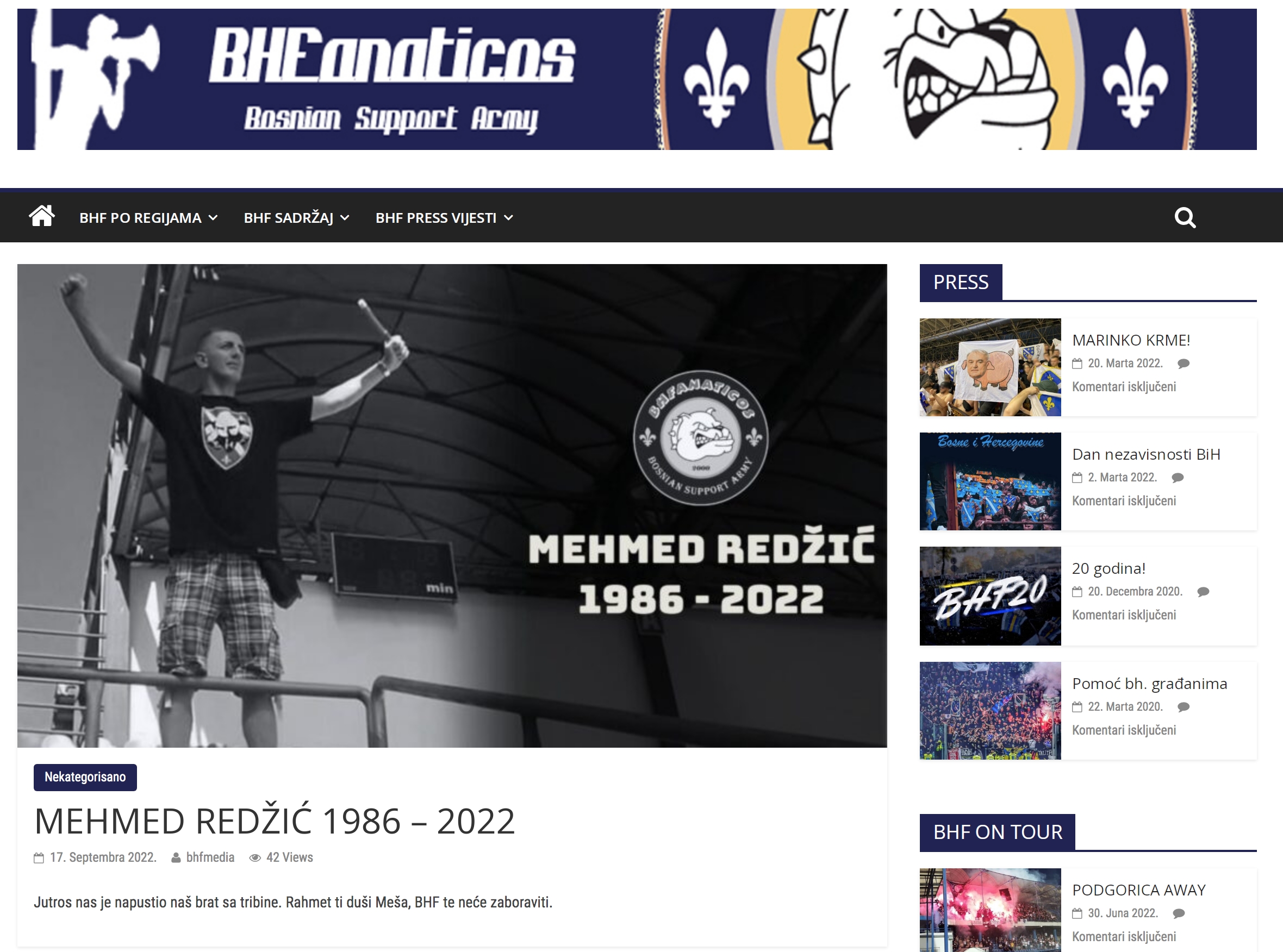 Navijačka grupa bosanskohercegovačke reprezentacije “BH Fanaticos” (Bosnian support army) objavom na svojim službenim stranicama oprostila se od prerano preminulog Busovljaka Mehmeda Redžića – Meše. Jučer su objavili vijest koju prenosimo u nastavku:
