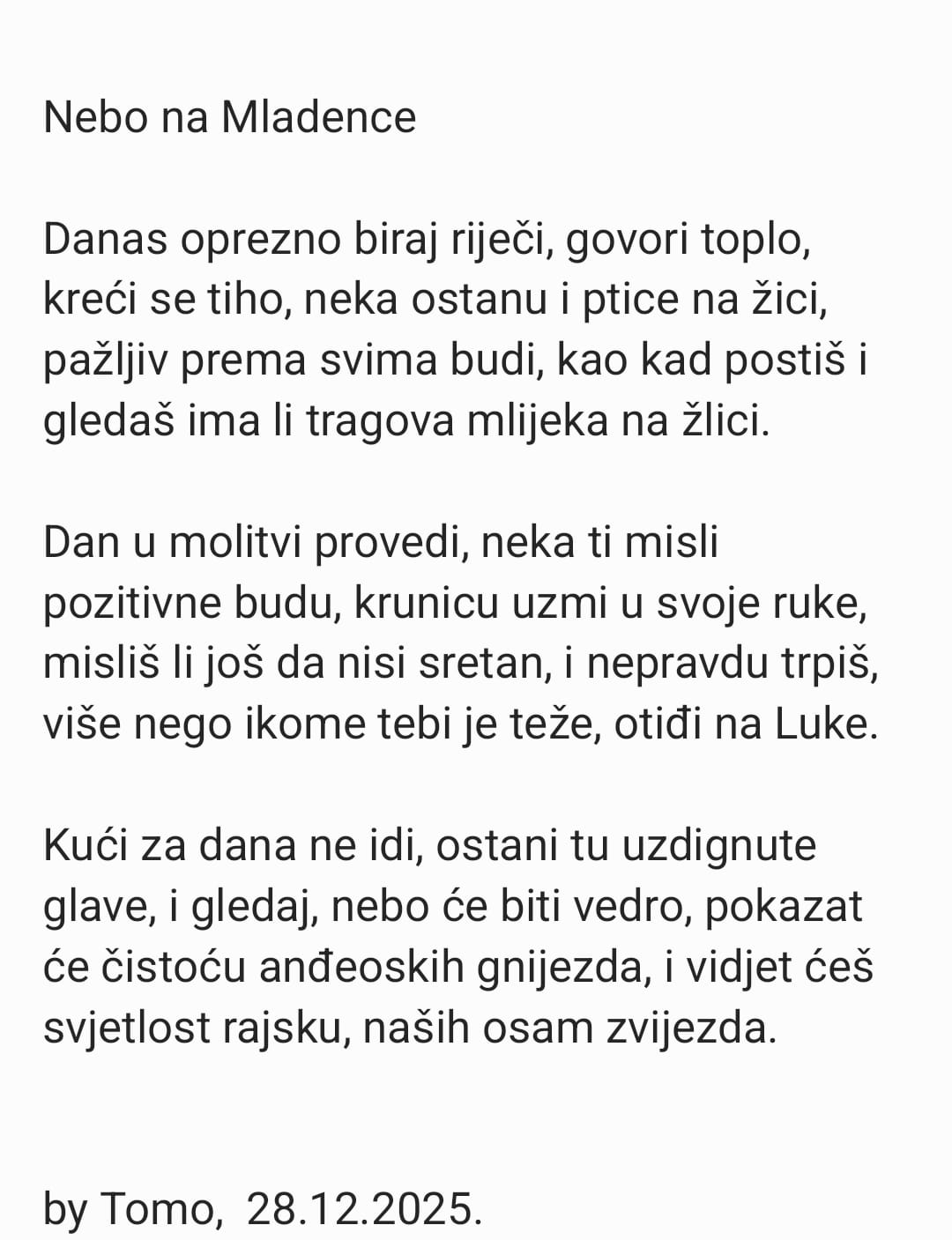 Pjesnik iz Posušja Tomo Raič, danas, na Blagdan nevine dječice – Mladence, bio je na Tribistovu, otišao na Luke, na mjestu stradanja posuških anđela i na tužno sjećanje na njih napisao pjesmu, piše TomislavNews.
