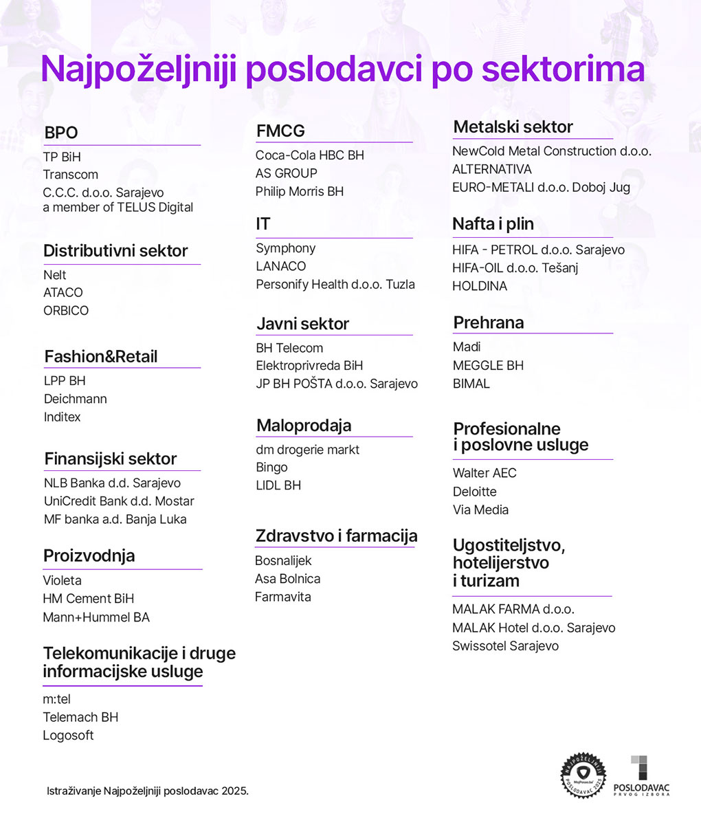 Među top 10 najpoželjnijih poslodavaca u BiH za 2025. godinu nalaze se kompanije iz različitih sektora gospodarstva, od trgovine i telekomunikacija do energetike, financijskoga sektora i proizvodnje.