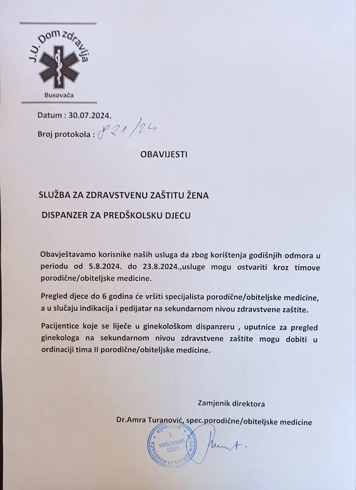 Obavijest iz Doma zdravlja Busovača