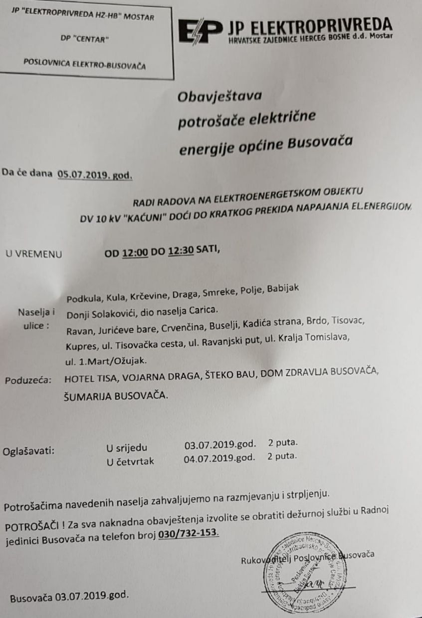 Iz poslovnice “Elektro” Busovača obavještavaju da će doći do kratkog prekida napajanja električnom energijom dana 5.srpnja (petak) u vremenu od 12:00 do 12:30 sati.