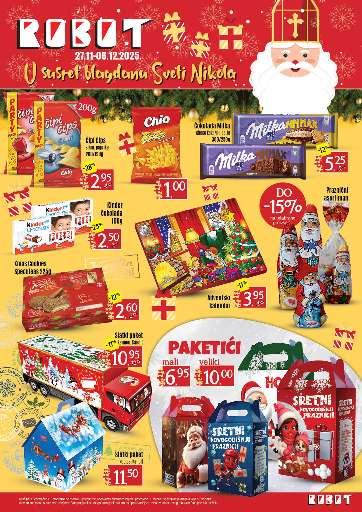 Trgovina Robot objavila je posebnu blagdansku ponudu povodom Svetog Nikole, koja traje od 27.11. do 06.12.2025. Kupce očekuje veliki izbor slatkih paketa, čokoladnih proizvoda, adventskih kalendara, blagdanskih asortimana te prigodnih darova za najmlađe.
