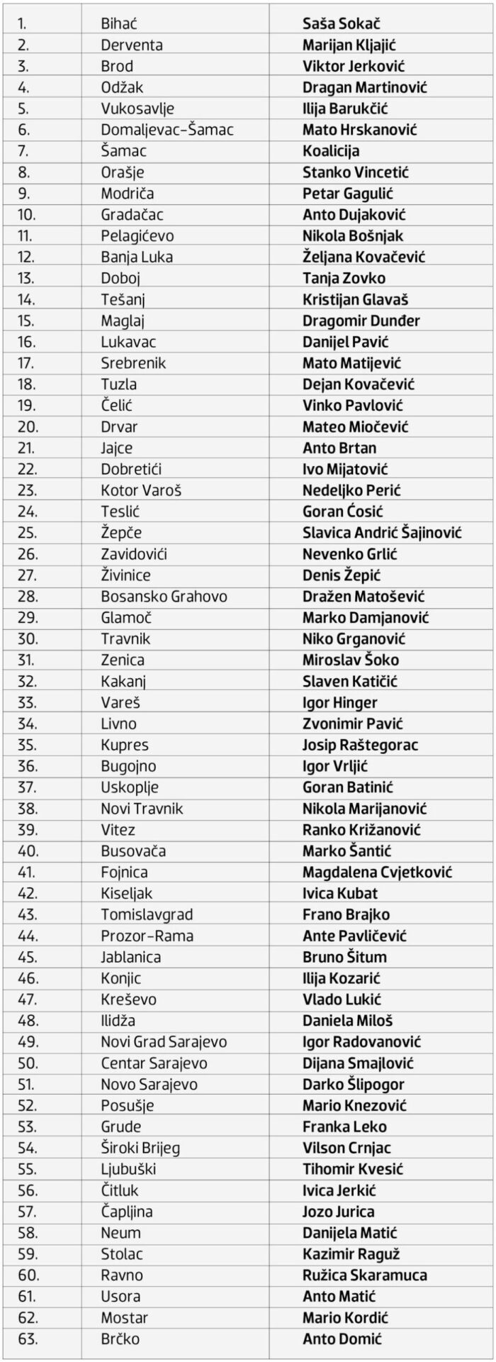 Spoj iskusnih dužnosnika koji su tijekom svoga mandata postigli zapažene rezultate u općinama i gradovima, ali i potpuno novih imena koja su se etablirala kroz djelovanje na nekim drugim razinama vlasti ili u gospodarstvu – kratki je presjek analize predloženih kandidata HDZ-a BiH za pozicije načelnika/gradonačelnika, njih 31 koji će 6. listopada na lokalnim izborima pokušati dobiti povjerenje građana.