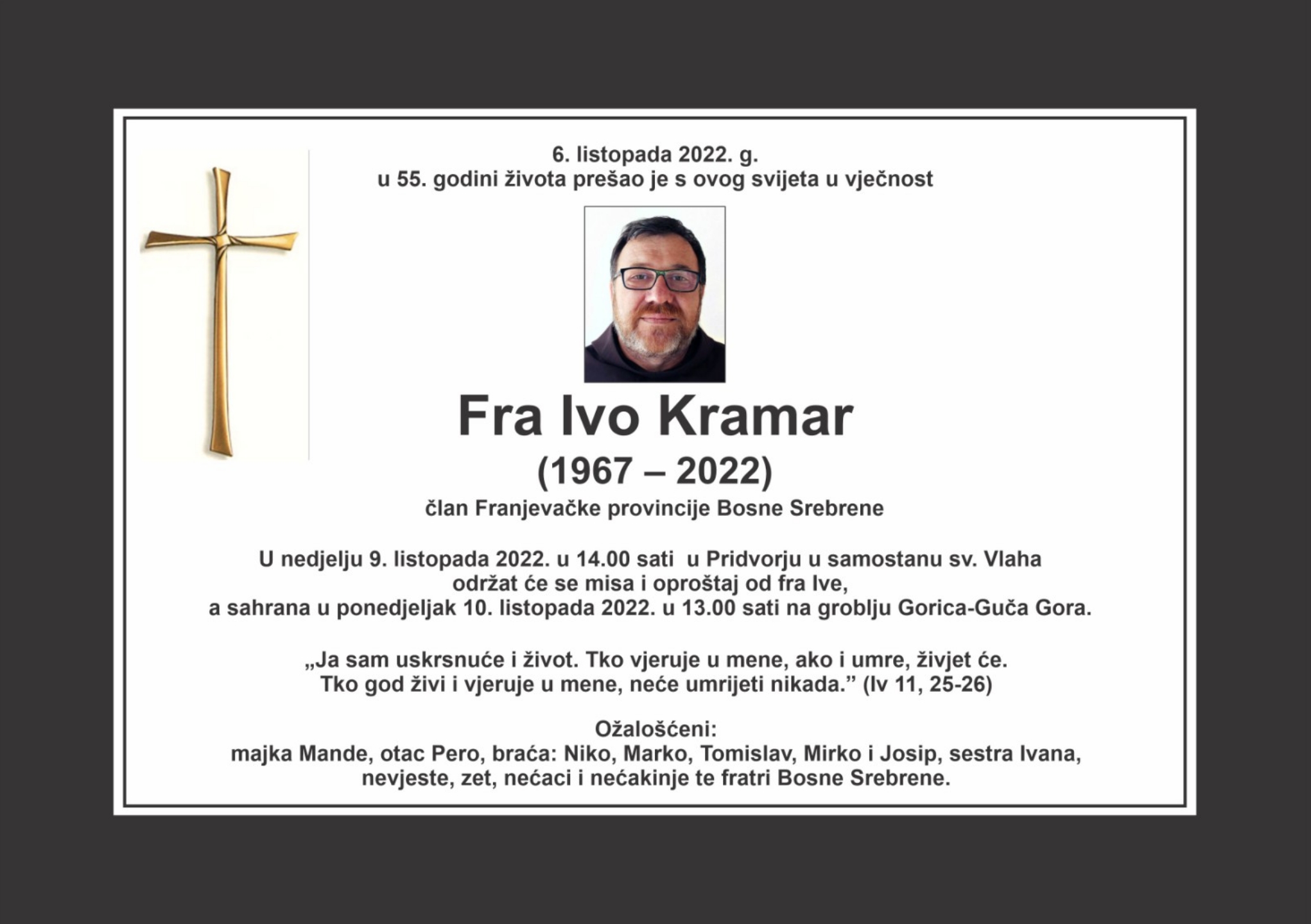 Osmrtnica: Fra Ivo Kramar. Iskrena sućut obitelji.
