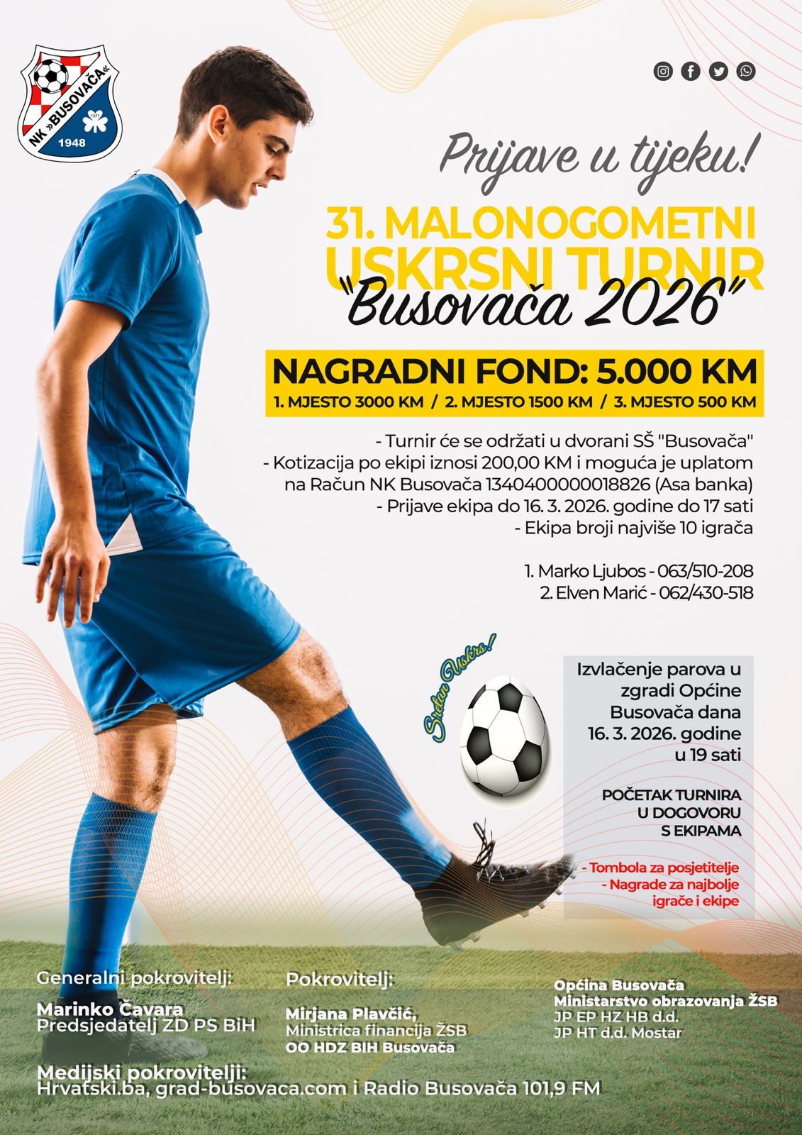 Nogometni klub NK Busovača otvorio je prijave za 31. malonogometni Uskrsni turnir „Busovača 2026“, koji će se održati u dvorani Srednje škole “Busovača”. Turnir i ove godine okuplja brojne ekipe i ljubitelje malog nogometa, a organizatori najavljuju zanimljive utakmice i bogat program za posjetitelje.