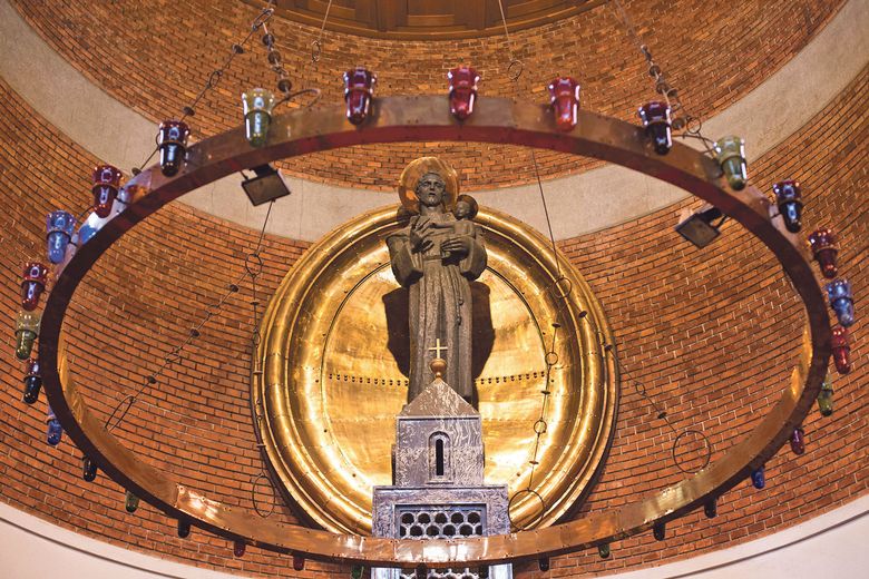 – To je dar Ivana Meštrovića. On je, kao što je poznato, u Beogradu radio spomenike iz srpske povijesti, pa je htio i nama ostaviti nešto od sebe. Odabrao je kip sv. Ante koji je postavljen 1956. godine iznad glavnog oltara kao da lebdi nad njim. Inače, kod svetišta treba imati na umu da je rađeno prije Drugog vatikanskog sabora i tada nije bilo ovog glavnog oltara, pa je od crnog mramora svetištu dan jedan plašt, gdje se slavila misa. Nakon Drugog vatikanskog sabora stavljen je drugi oltar da bi se omogućilo slavljenje mise prema zahtjevima obnovljene liturgije – objasnio nam je fra Benedikt.
