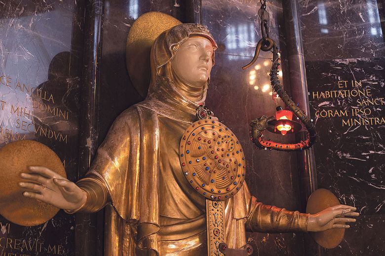 – Dao joj je lik jedne bizantske, istočnjačke žene sa slikom goluba koji predstavlja simbol Duha Svetoga da se istakne Isusovo začeće. Osim aureola iza glave i ruku, zanimljiva je i lampa koja stoji sa strane i koju drži zmija kao simbol Vraga, koji je rekao da neće služiti Bogu, a onda je Plečnik rekao: ‘Buš služil!’ i stavio je Vragu svjetiljku u usta da mora stalno svijetliti Gospi – smije se fra Benedikt dok nam objašnjava simboliku Gospina kipa, a onda otkriva i jednu nevjerojatnu zanimljivost.