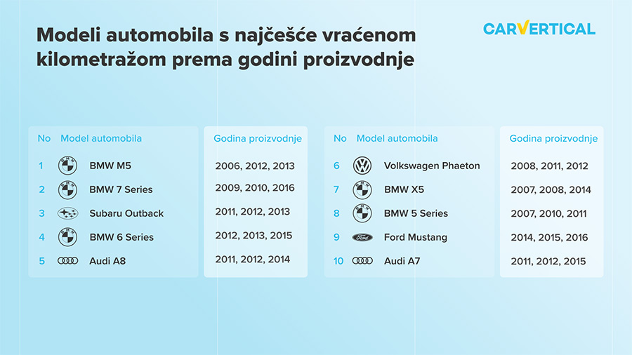 Da bi se odredio popis automobila kojima je najčešće vraćena kilometraža, IT tvrtka carVertical analizirala je više od 700 000 izvješća o povijesti rabljenih automobila generiranih između studenog 2020. i studenog 2021. godine. Analizirano je 18 različitih tržišta, uključujući: Poljsku, Rumunjsku, Mađarsku, Francusku, Sloveniju, Slovačku, Češku, Litvu, Latviju, Estoniju, Ukrajinu, Bugarsku, Srbiju, Njemačku, Hrvatsku, Rusiju, Sjedinjene Američke Države i Italiju.
