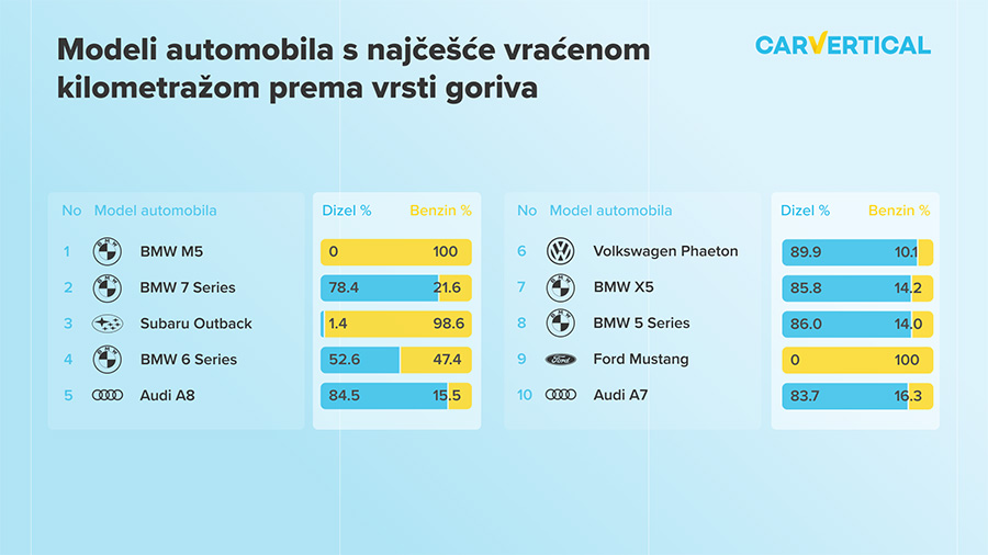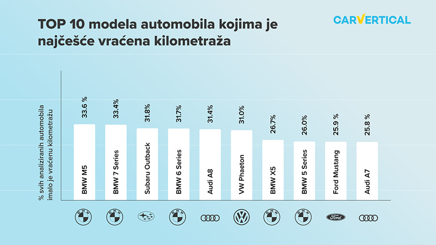 Kao što pokazuju podaci o kilometraži, BMW M5 je automobil s najčešće vraćenom kilometražom, s nešto više od trećine provjerenih modela za koje postoji mogućnost vraćene kilometraže. Međutim, sama ova statistika ne prikazuje dovoljno opseg problema BMW-ovih automobila s vraćenim odometrom – kao što je nedavno istaknuo Matas Buzelis, stručnjak za automobile u carVerticalu, BMW-ovi automobili dominiraju popisom: