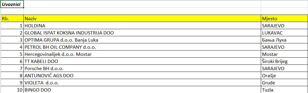 Na listi TOP 10 najvećih bh. uvoznika za razliku od prethodne godine se našla i kompanija Bingo zauzevši deseto mjesto. Kada je riječ o najvećim izvoznicima za prvih šest mjeseci ove godine, i tu su se dogodile određene izmjene u odnosu na prethodnu godinu.