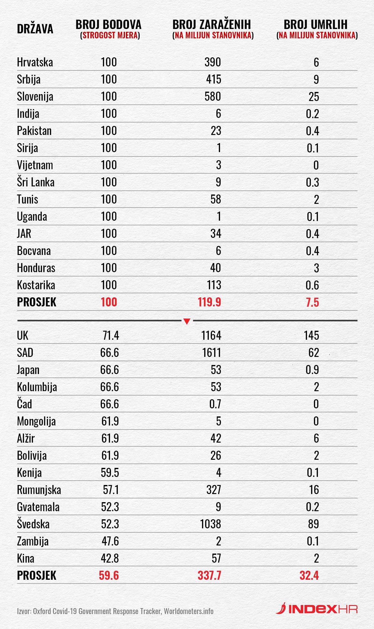 Hrvatska na rang-ljestvici strogosti mjera Oxford Covid-19 Government Response Trackera ima maksimalnih 100 bodova. Ipak, nije jedina. Maksimalnih 100 bodova imaju i Srbija, Slovenija, Indija, Pakistan, Sirija, Vijetnam, Šri Lanka,Tunis, Uganda, Južnoafrička Republika, Bocvana, Madagaskar, Honduras i Kostarika.