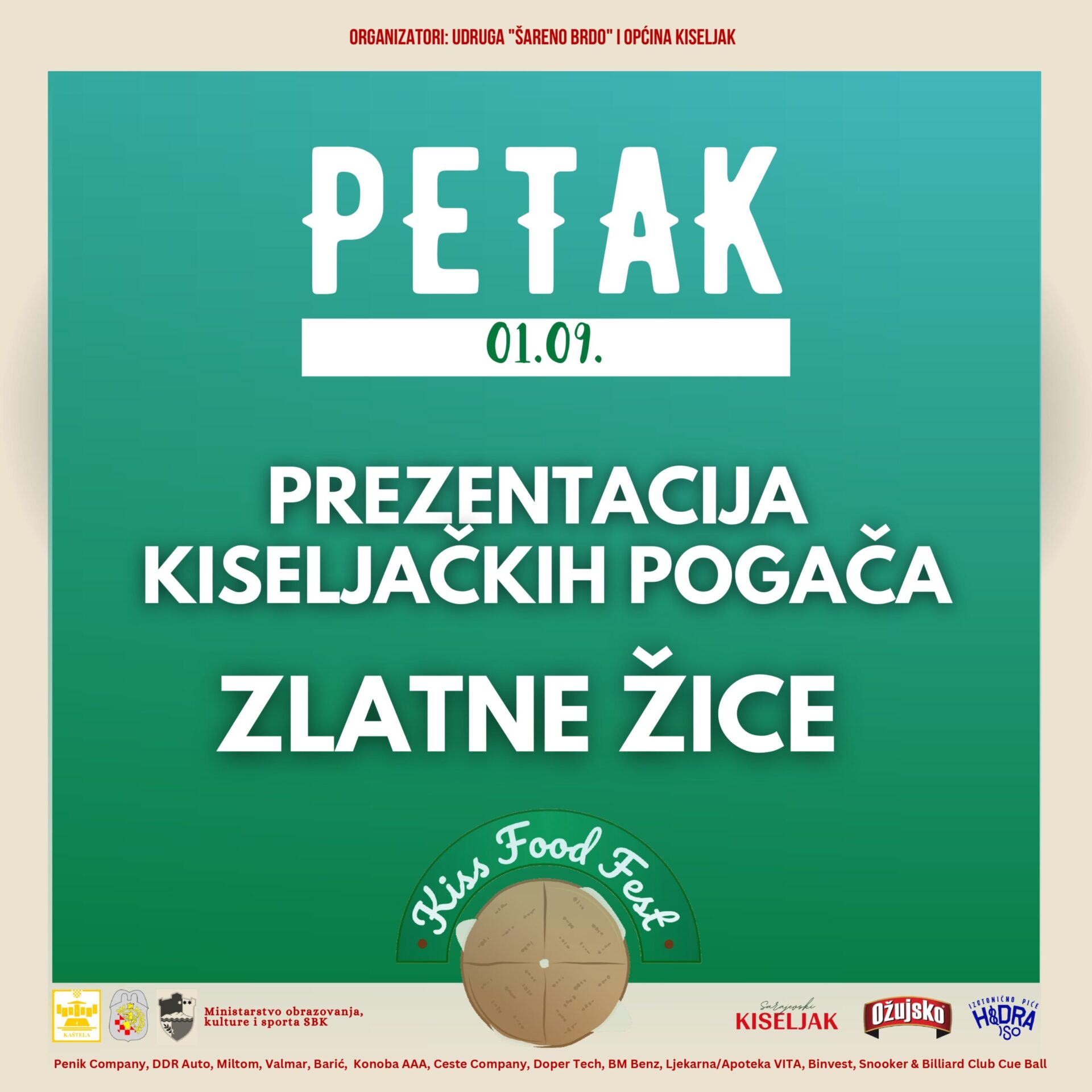 Trodnevni gastro – program pratit će i brojne glazbene izvedbe, uključujuči i sastav Zlatne žice, DJ G i DJ Soul te bendovi Domino Efekt i Tregeri. Prvi dan festivala posvećen je promidžbi široko poznate kiseljačke pogačice, jela specifičnog za ovu lokalnu zajednicu po kojem je Kiseljak poznat. Opjevanu pogačicu u kolovozu 2022. godine Općina Kiseljak, u suradnji sa Federalnim ministarstvom kulture i sporta, kandidirala je za UNESCO popis zaštićene nematerijalne baštine. Posjetitelji će prvi dan imati priliku kušati ovo jelo besplatno, uz široku ponudu i drugih jela street food karaktera.