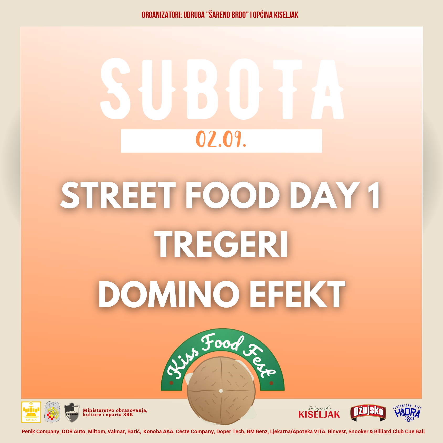 Trodnevni gastro – program pratit će i brojne glazbene izvedbe, uključujuči i sastav Zlatne žice, DJ G i DJ Soul te bendovi Domino Efekt i Tregeri. Prvi dan festivala posvećen je promidžbi široko poznate kiseljačke pogačice, jela specifičnog za ovu lokalnu zajednicu po kojem je Kiseljak poznat. Opjevanu pogačicu u kolovozu 2022. godine Općina Kiseljak, u suradnji sa Federalnim ministarstvom kulture i sporta, kandidirala je za UNESCO popis zaštićene nematerijalne baštine. Posjetitelji će prvi dan imati priliku kušati ovo jelo besplatno, uz široku ponudu i drugih jela street food karaktera.