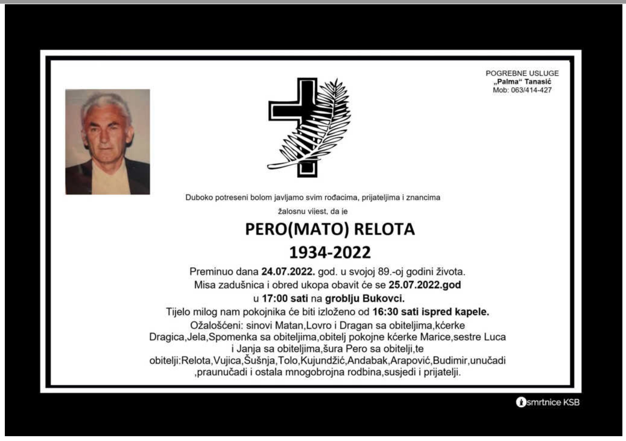Duboko potreseni bolom javljamo svim rođacima, prijateljima i znancima žalosnu vijest, da je Pero (Mato) Relota preminuo dana 24. srpnja 2022. godine u svojoj 89. godini života.
