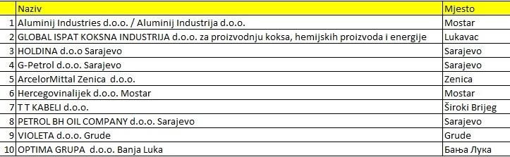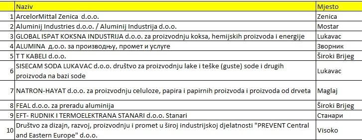 Na sedmom mjestu je Natron-hayat za proizvodnju celuloze, papira i papirnih proizvoda i proizvoda od drveta iz Maglaja, a na osmom FEAL d.o.o. za preradu aluminija – Široki Brijeg.