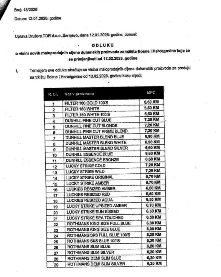 Nove maloprodajne cijene cigareta tvrtke TDR vrijedit će već od 13. veljače, potvrđeno je iz Uprave za neizravno oporezivanje BiH.
