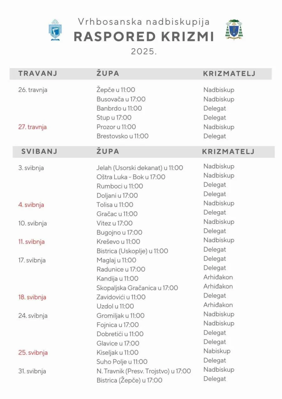 Vrhbosanska nadbiskupija objavila je raspored krizmi za 2025. godinu.